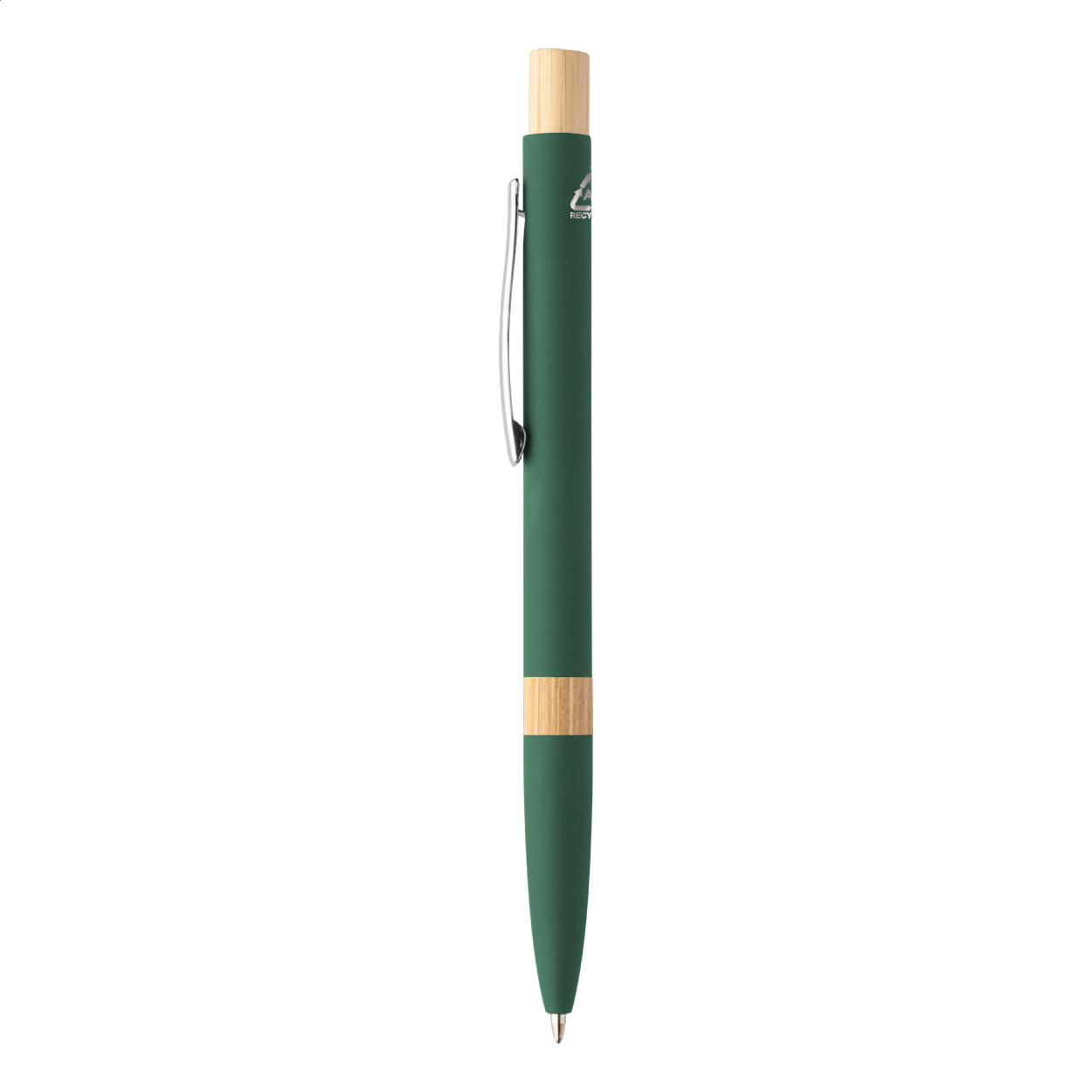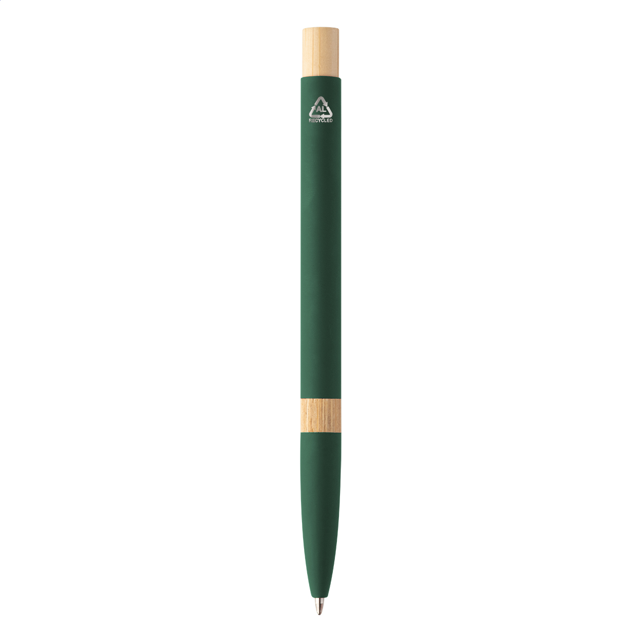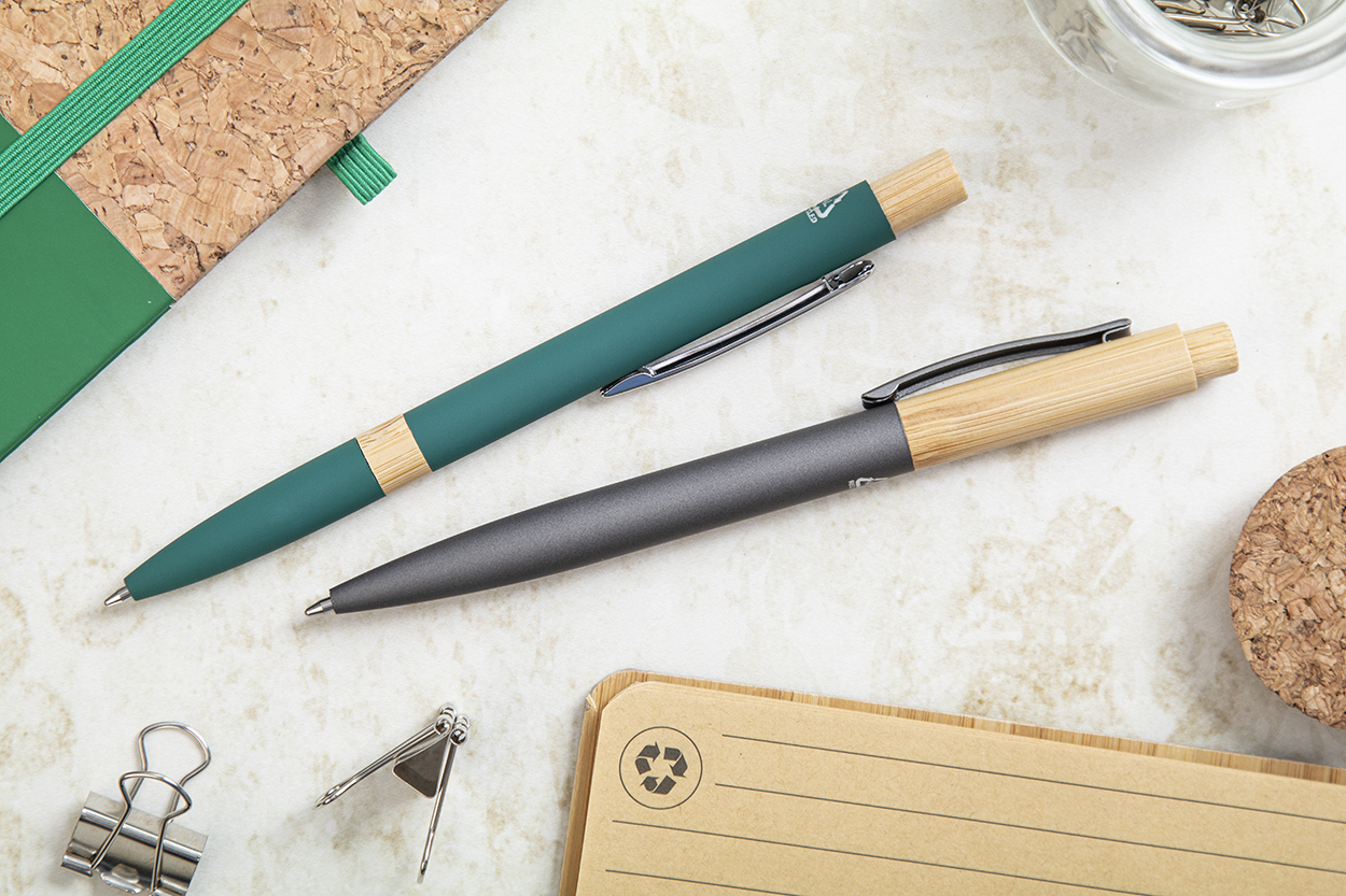 Penna a sfera in alluminio riciclato con parti in bambù, clip cromata, refill blu e rivestimento gommato speciale per incisione laser a specchio.