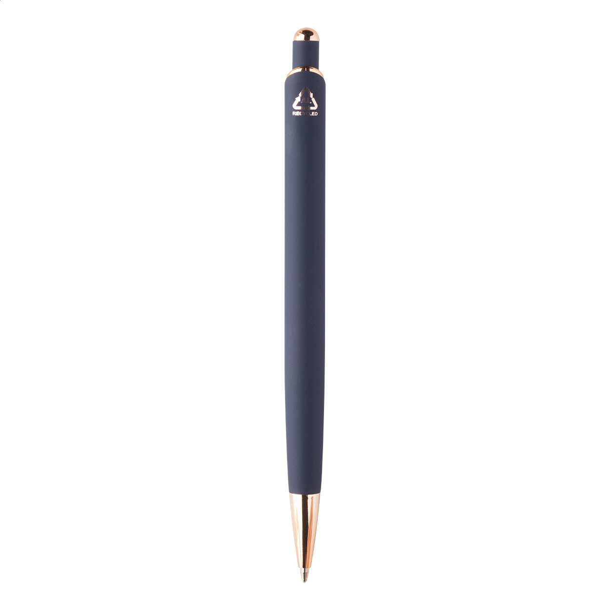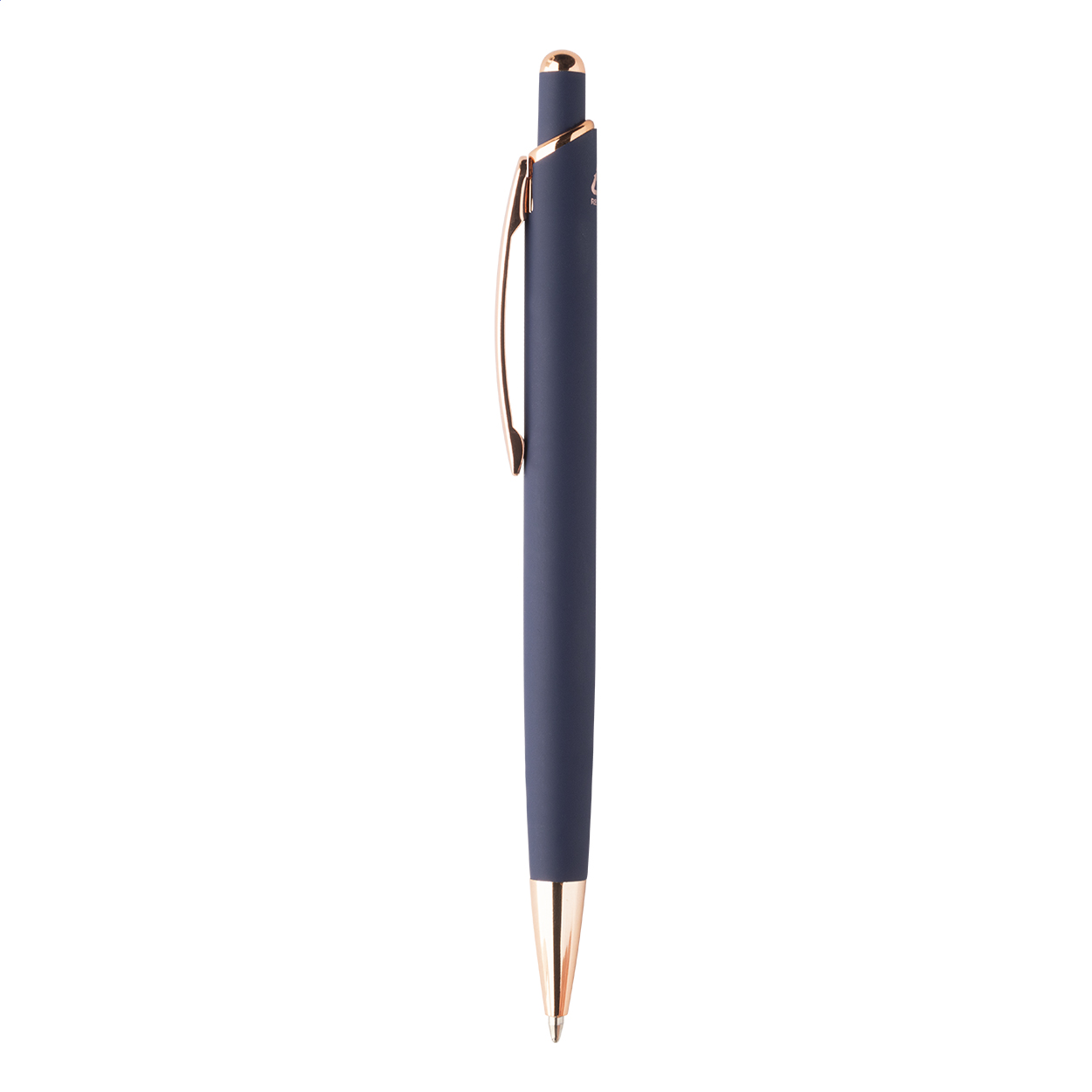 Penna a sfera in alluminio, dettagli in color oro rosa, refill blu e rivestimento gommato speciale per incisione laser a specchio in colore oro rosa.