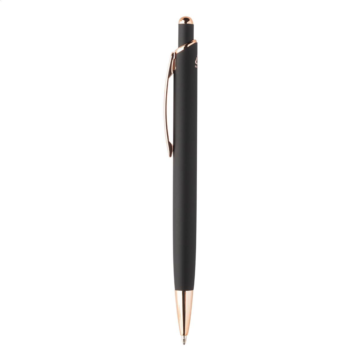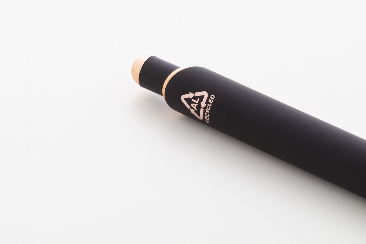 Penna a sfera in alluminio, dettagli in color oro rosa, refill blu e rivestimento gommato speciale per incisione laser a specchio in colore oro rosa.