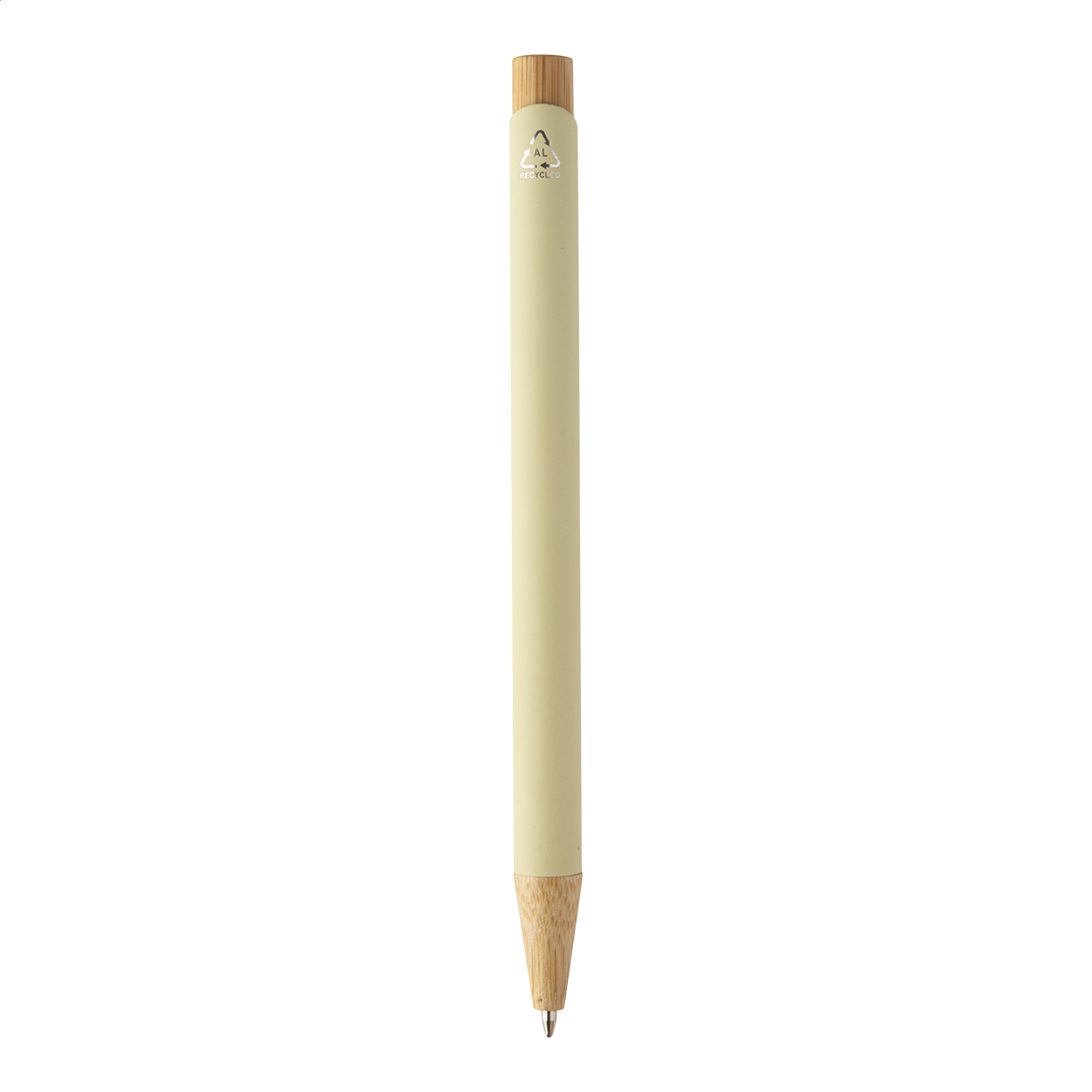 Penna a sfera in alluminio riciclato con parti in bambù, clip cromata, refill blu e speciale rivestimento gommato per incisione laser a specchio.