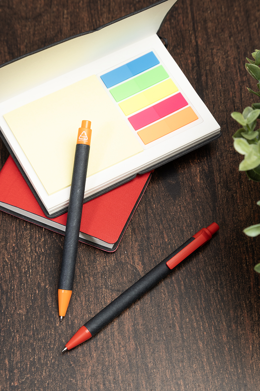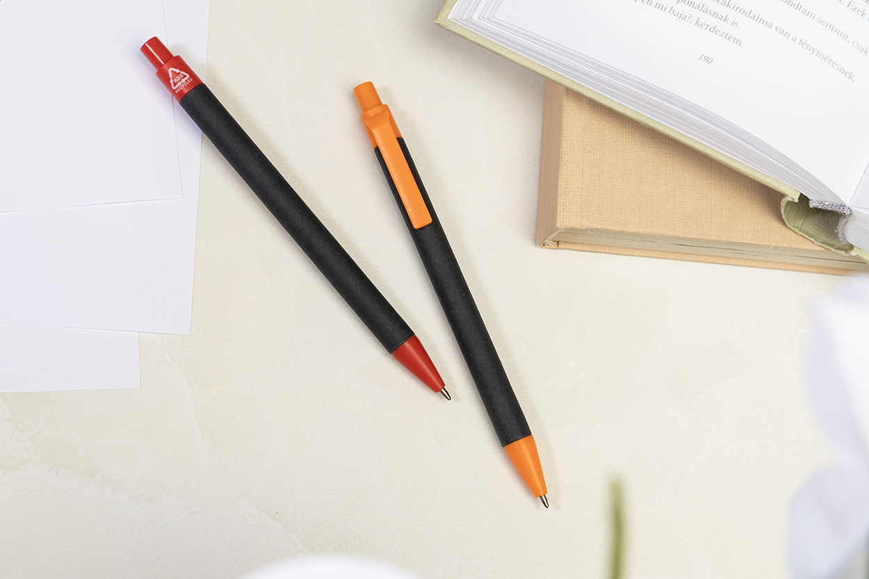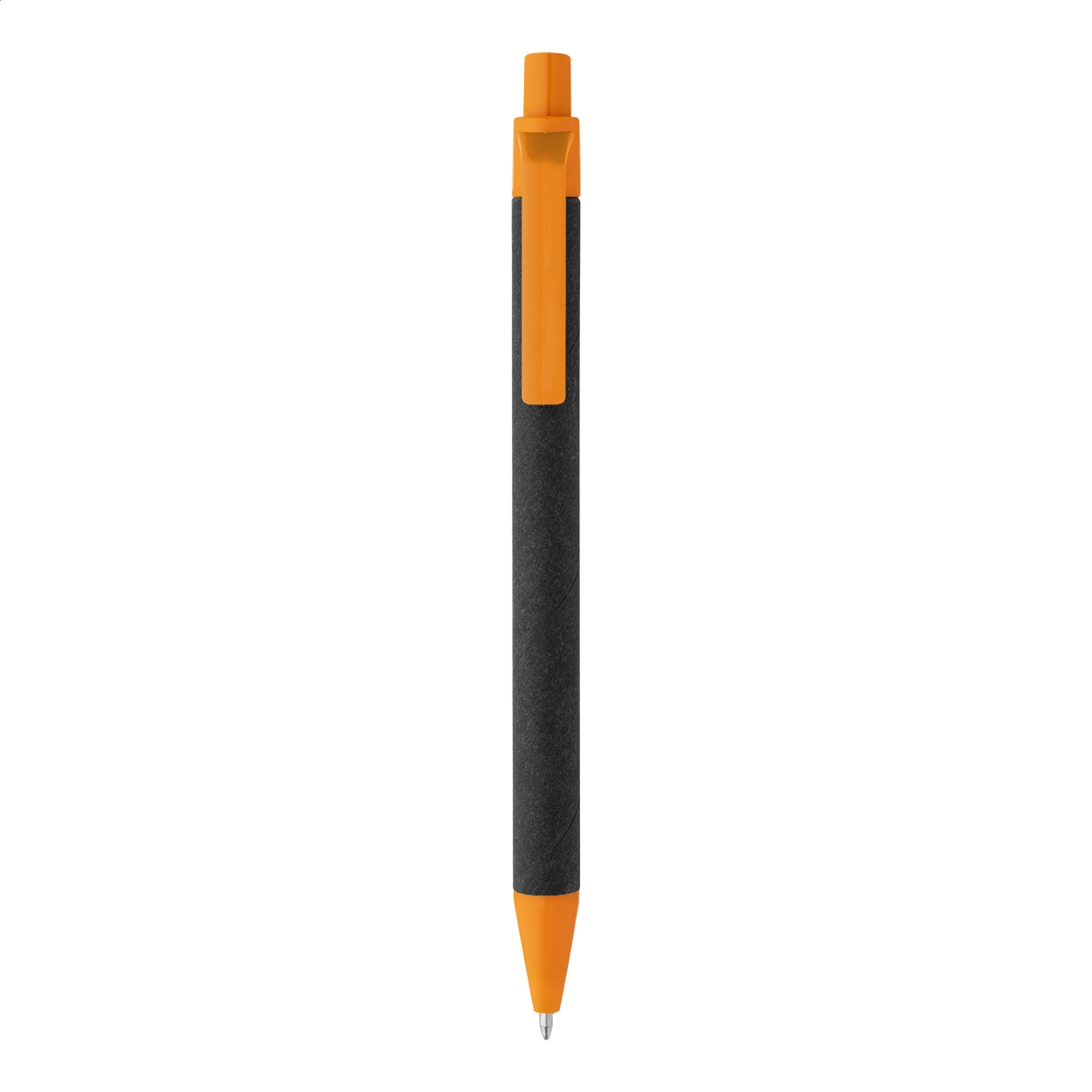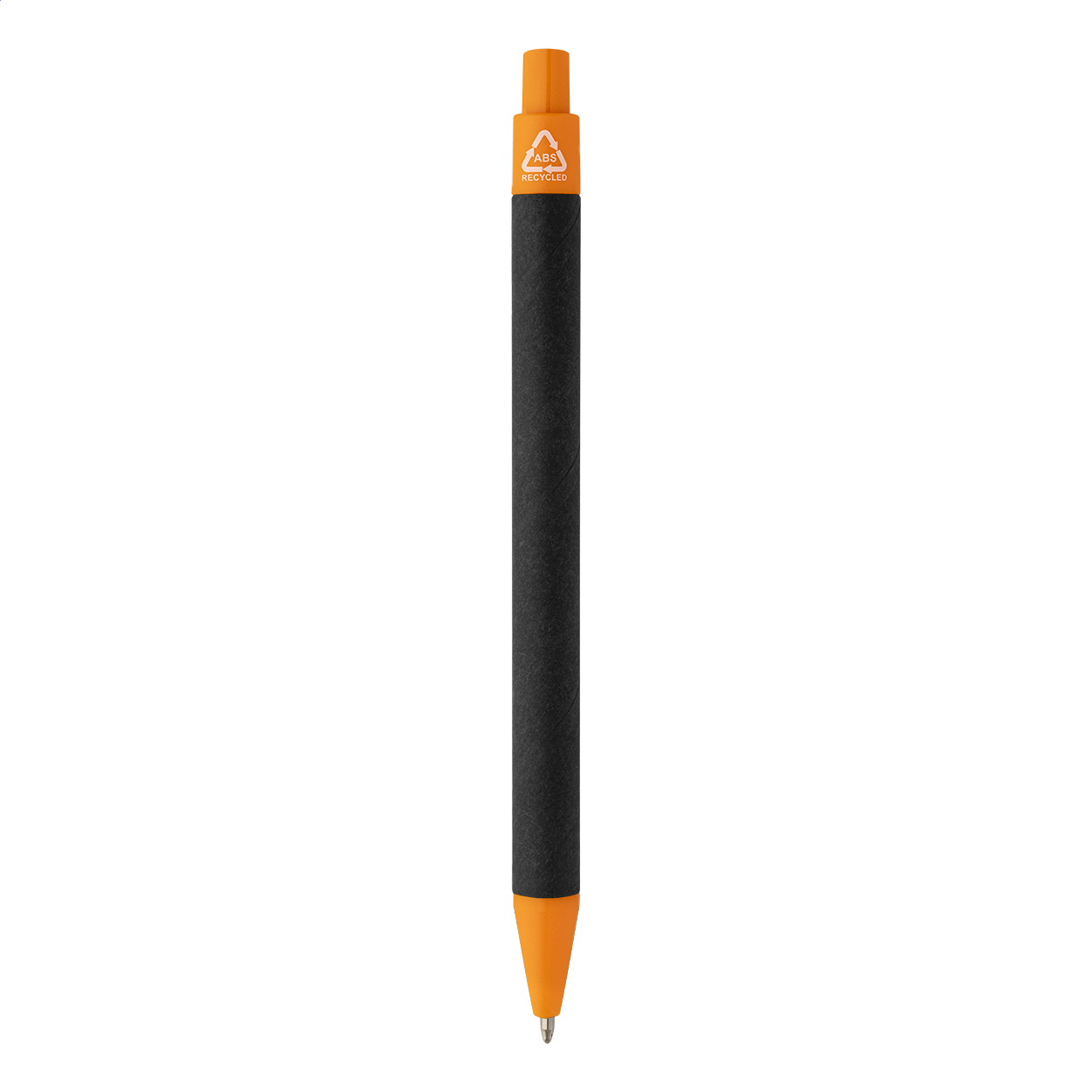 Penna a sfera in carta riciclata con corpo nero, elementi in ABS riciclato e refill blu.