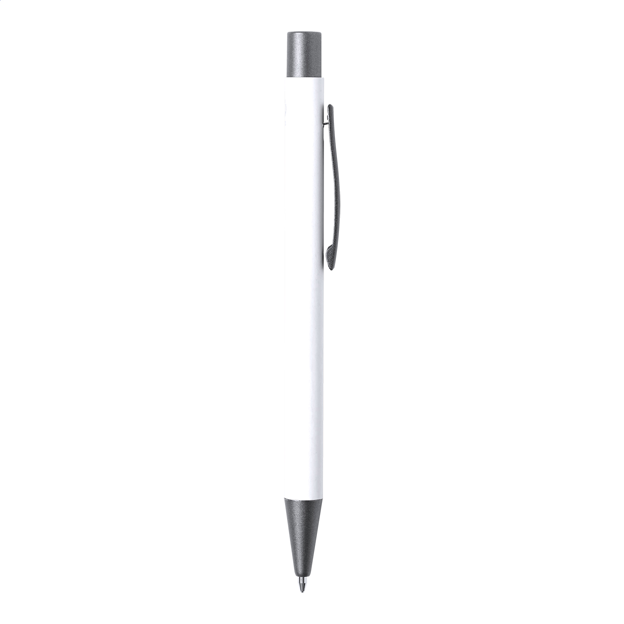 Penna a sfera in alluminio riciclato con finiture color canna di fucile. Con refill blu.