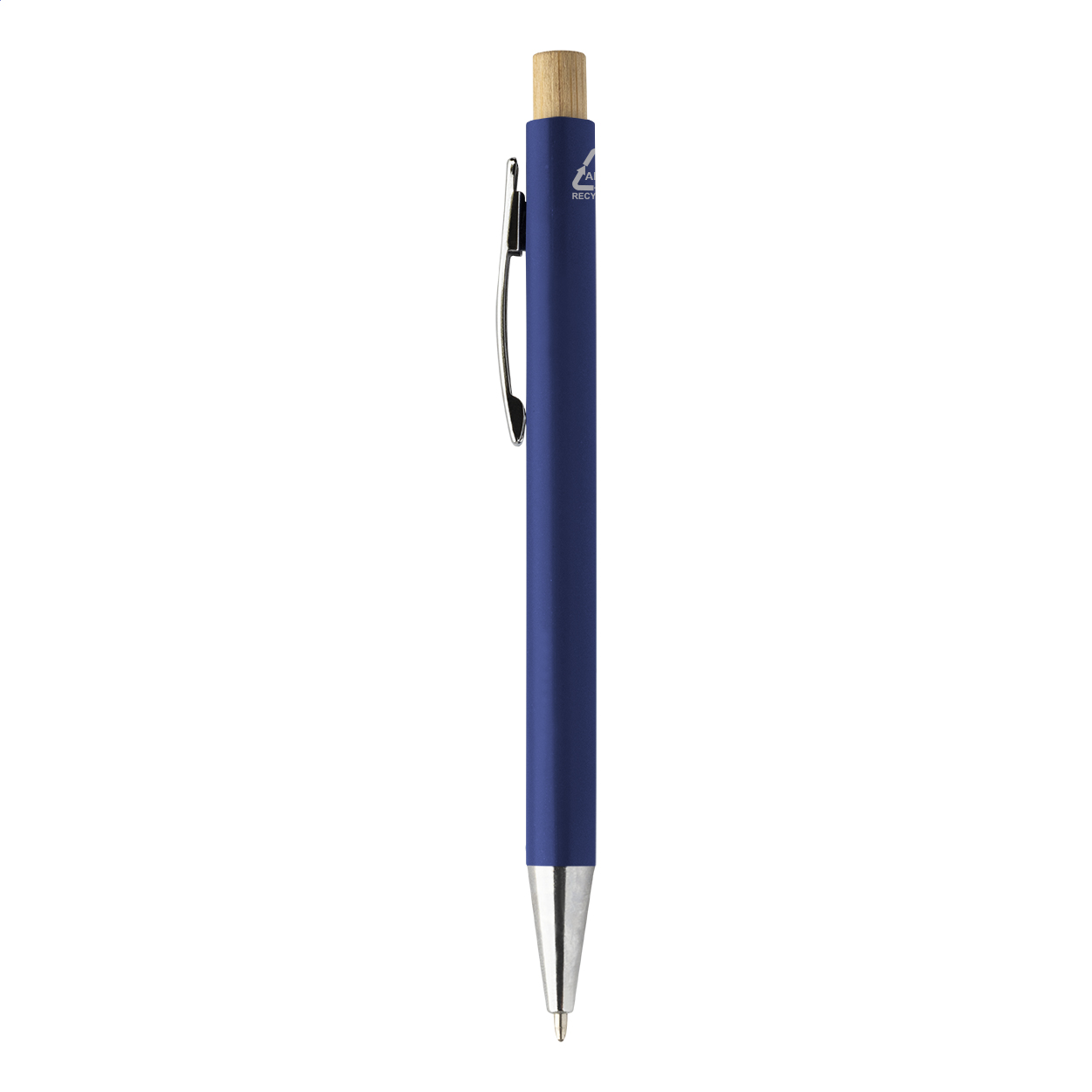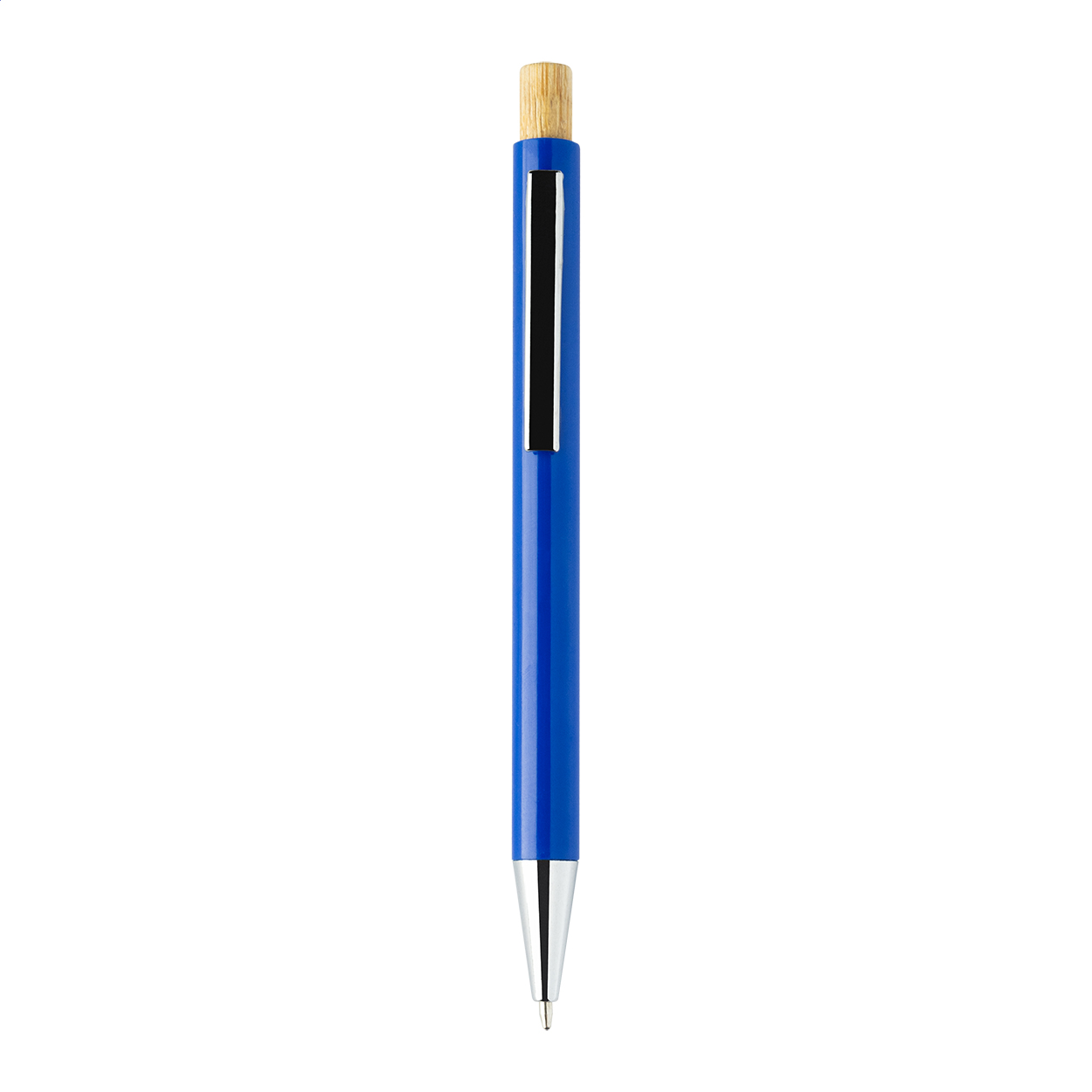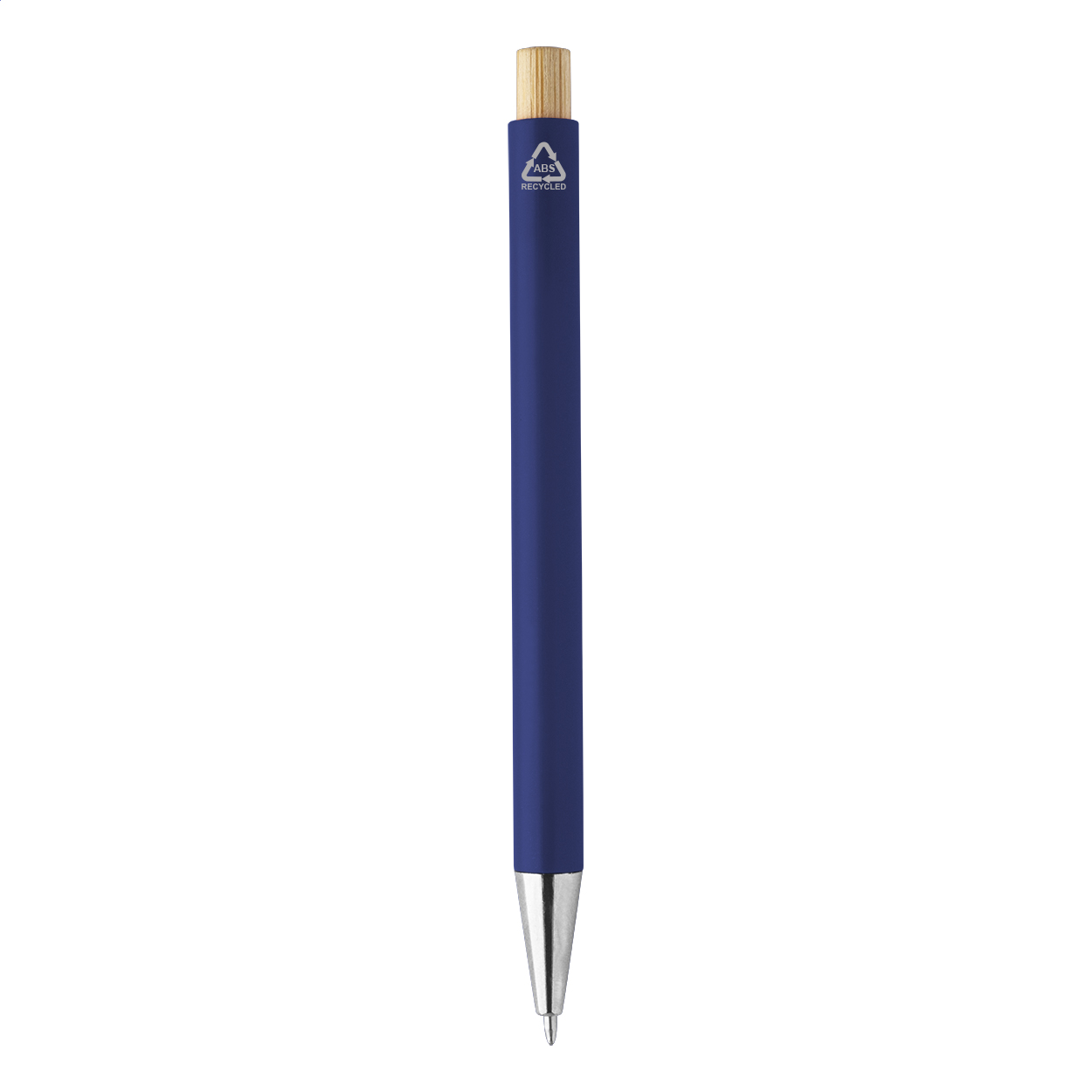 Penna a sfera in plastica ABS riciclata con pulsante in bambù, clip in metallo e refill blu.