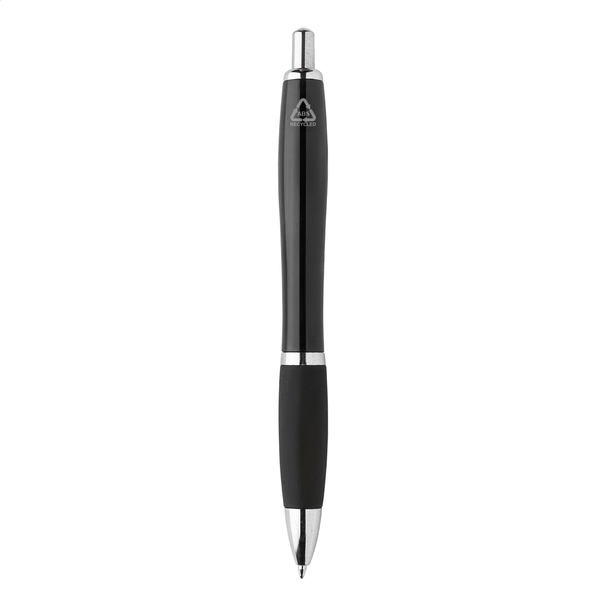 Penna a sfera in plastica ABS riciclata con refill blu, impugnatura in colore coordinato e parti cromate.