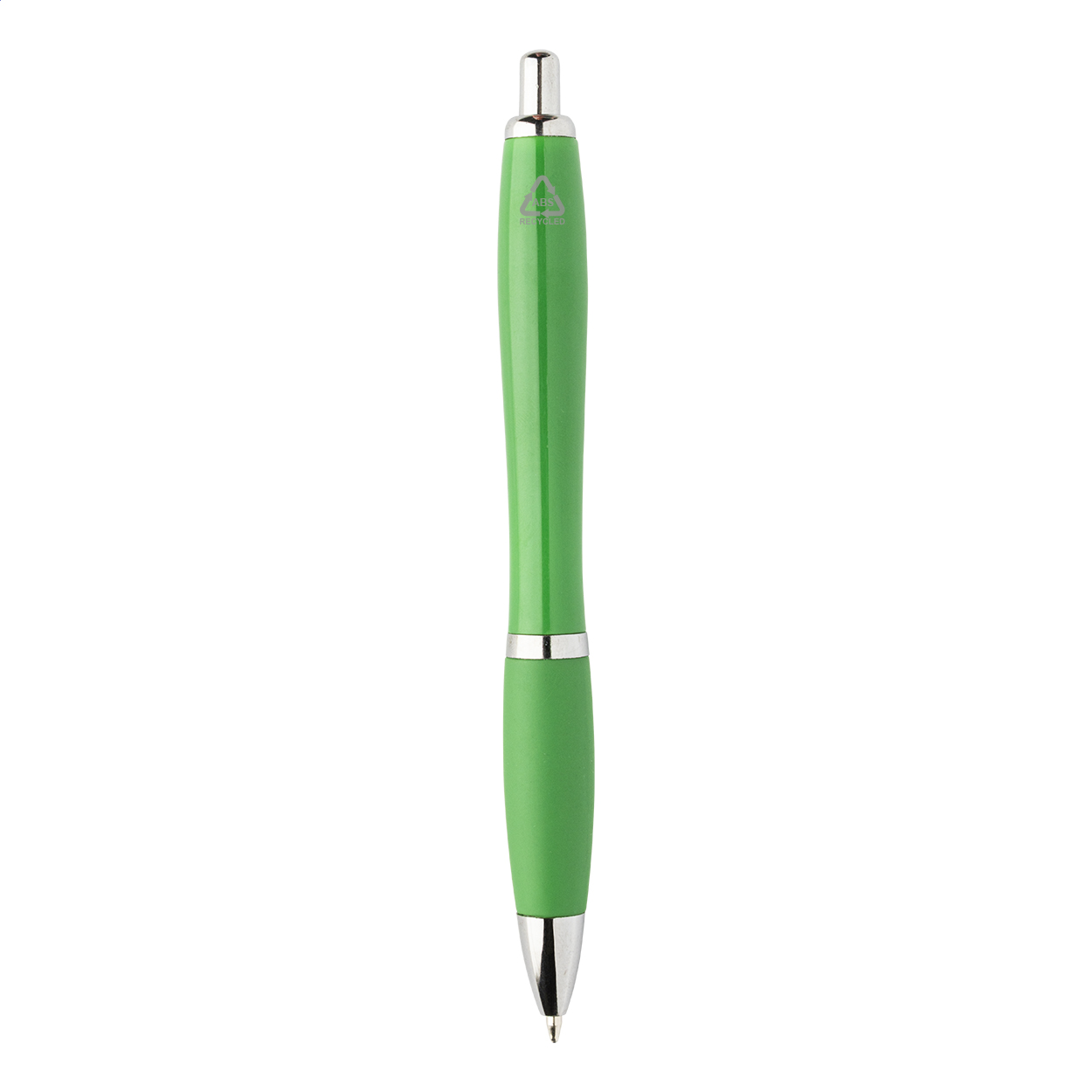Penna a sfera in plastica ABS riciclata con refill blu, impugnatura in colore coordinato e parti cromate.