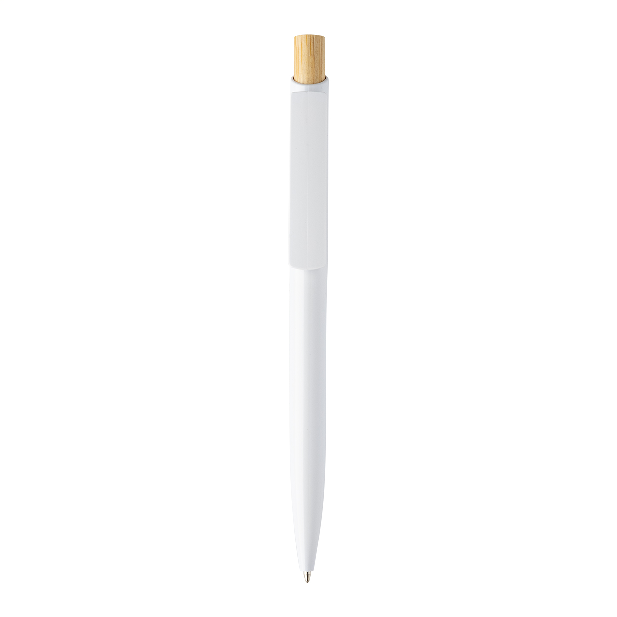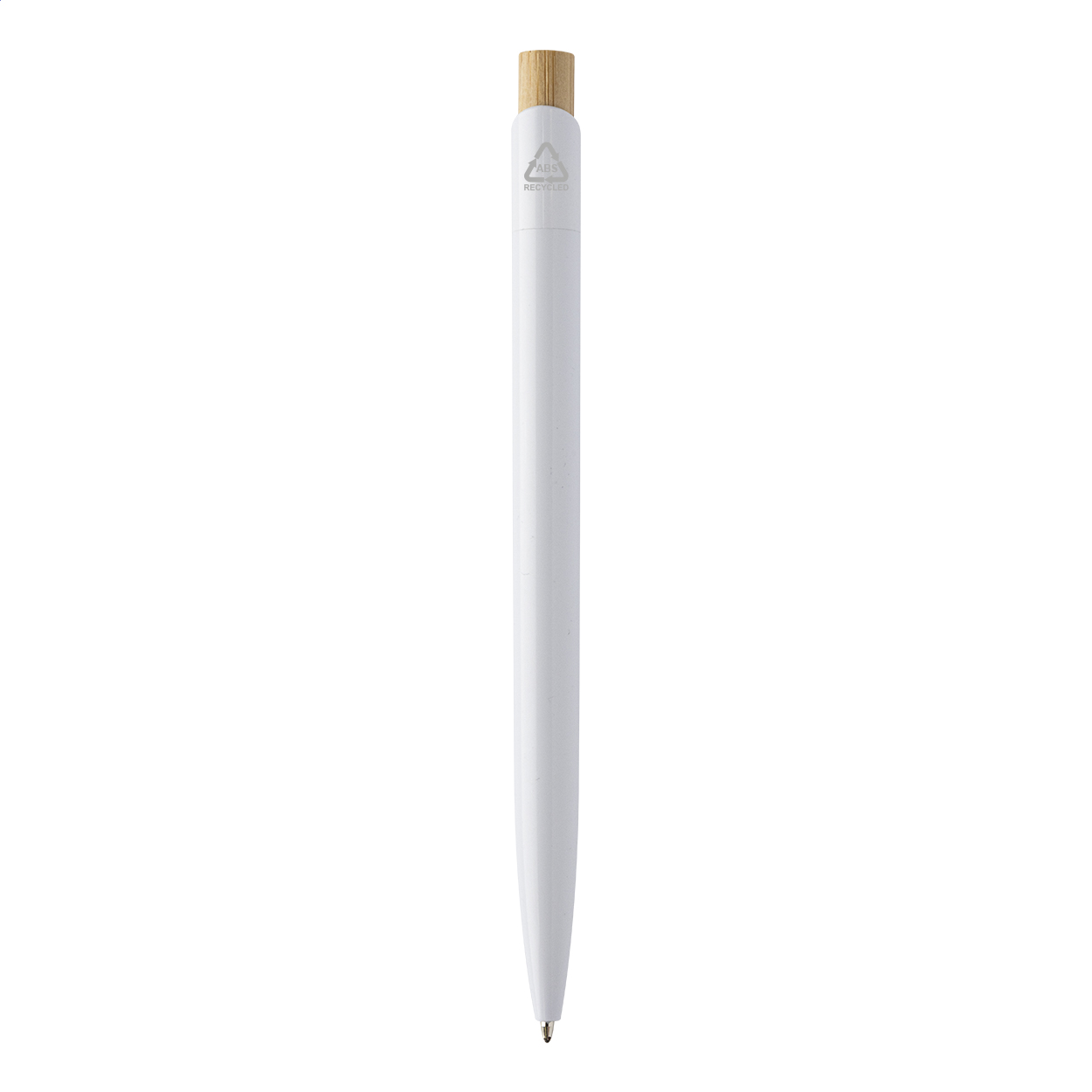 Penna a sfera in plastica ABS riciclata con pulsante in bambù e refill blu.