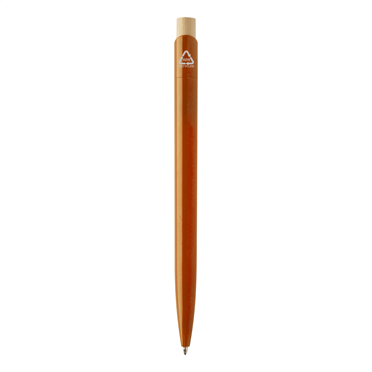 Penna a sfera in plastica ABS riciclata con pulsante in bambù e refill blu.