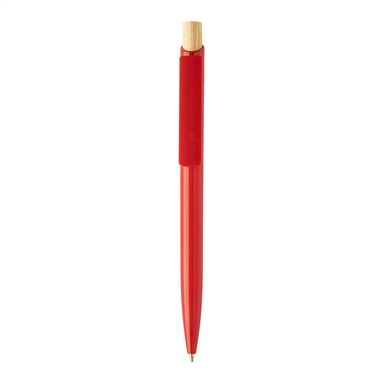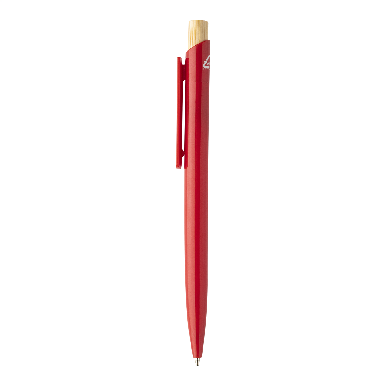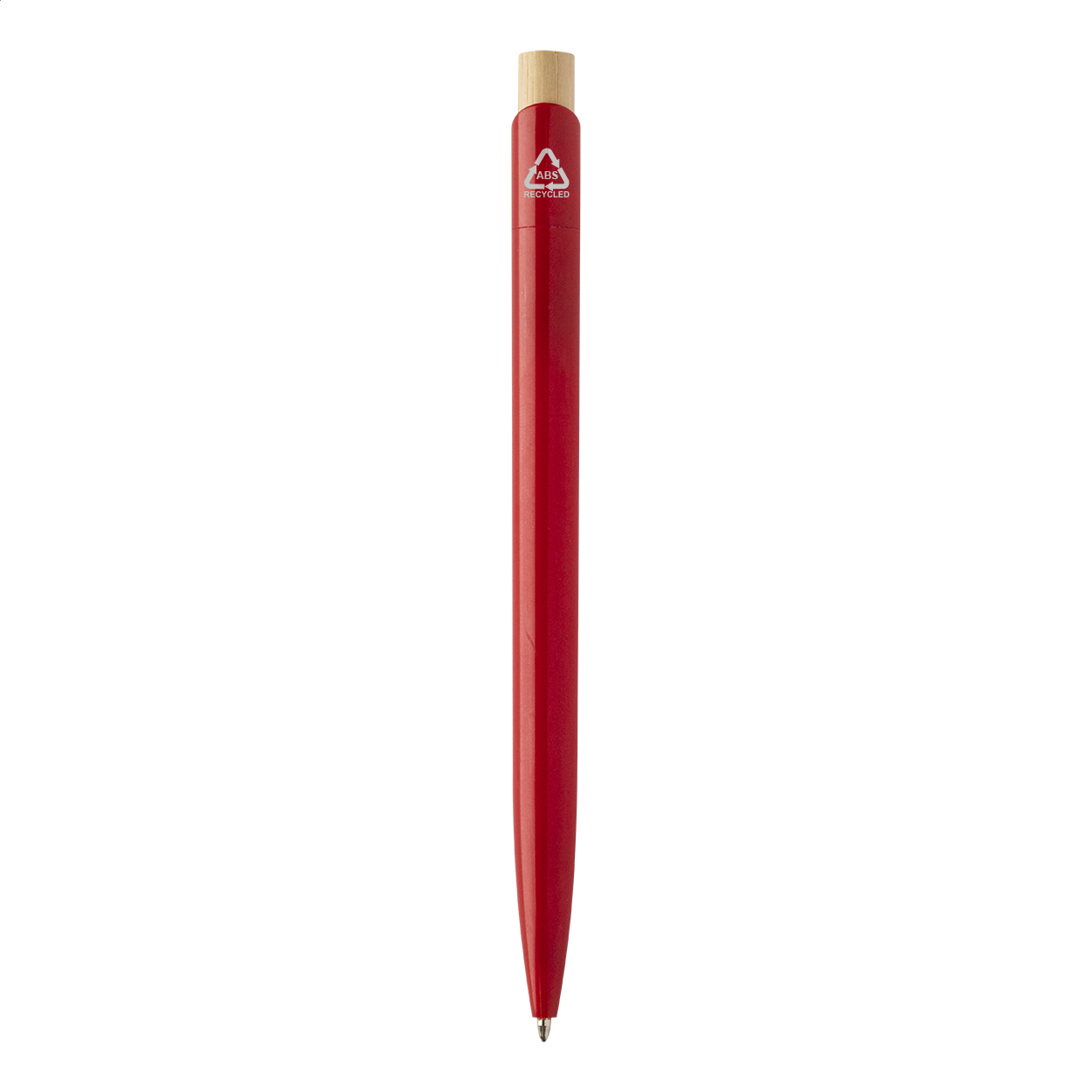 Penna a sfera in plastica ABS riciclata con pulsante in bambù e refill blu.