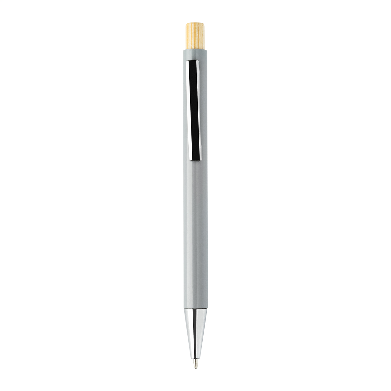 Penna a sfera in plastica ABS riciclata con pulsante in bambù, clip in metallo e refill blu.