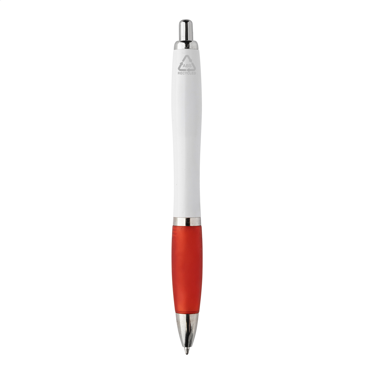 Penna a sfera in plastica ABS riciclata con refill blu, fusto bianco, impugnatura colorata e parti cromate.