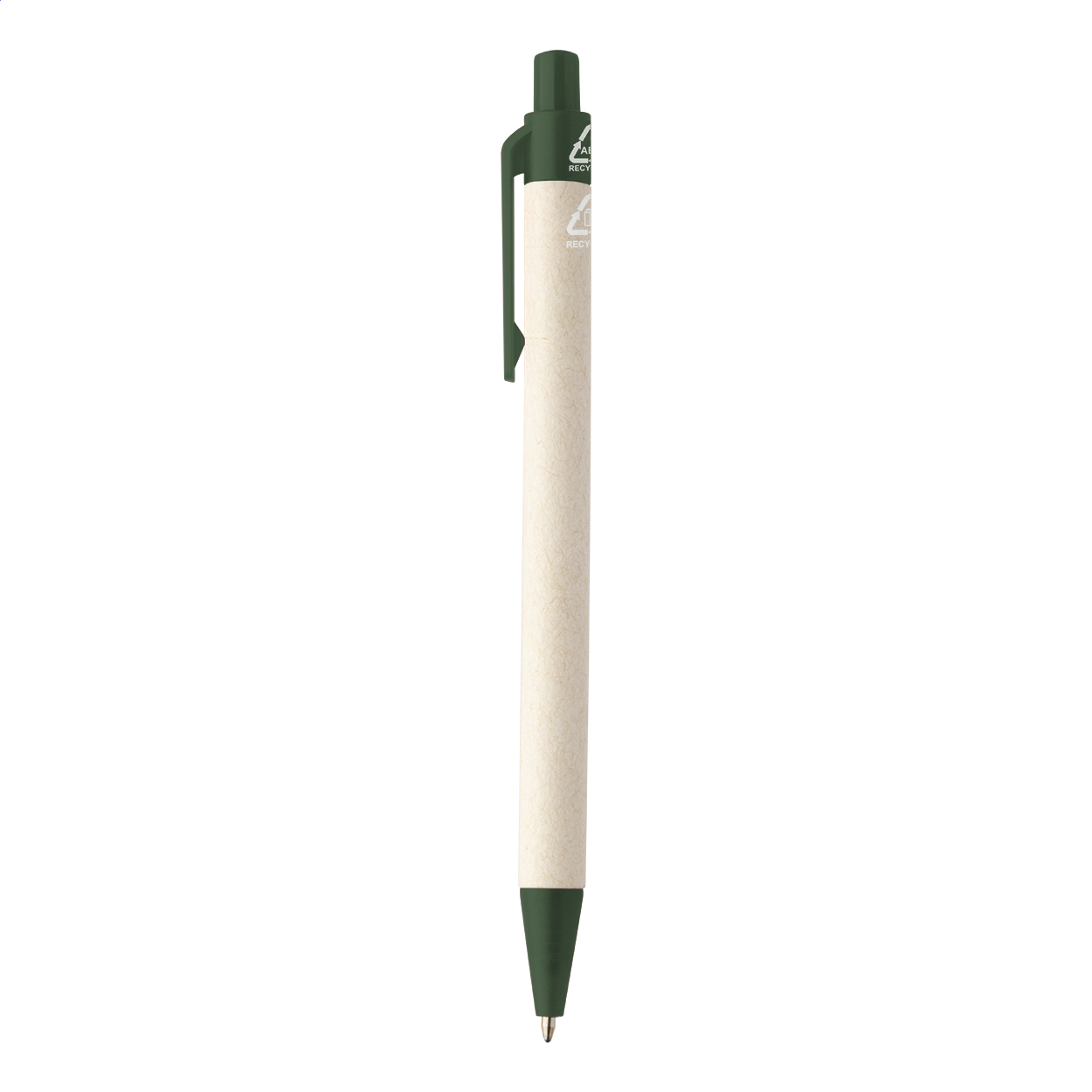 Penna a sfera realizzata con carta di cartone del latte riciclata, parti in plastica ABS riciclata e refill blu.