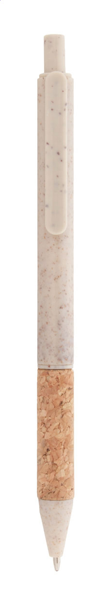Penna a sfera in plastica ecologica di paglia di grano con impugnatura in sughero naturale e parti colorate. Con refill blu.