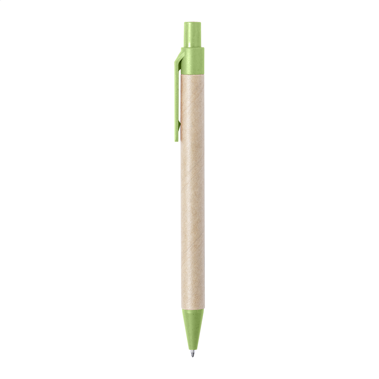 Penna a sfera con corpo in carta riciclata e parti in plastica ecologica di paglia di grano. Con refill blu.