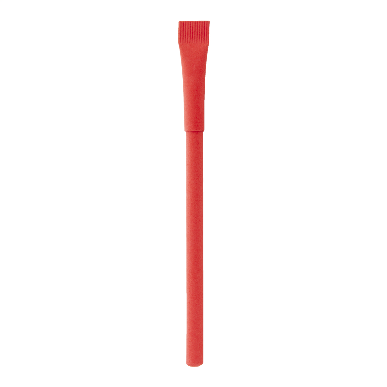 Penna senza inchiostro a lunga durata in carta riciclata, cappuccio in colore coordinato, parti in plastica di paglia di grano e punta in lega metallica che ossida la carta. Questa penna scrive come una matita ed è anche cancellabile.
