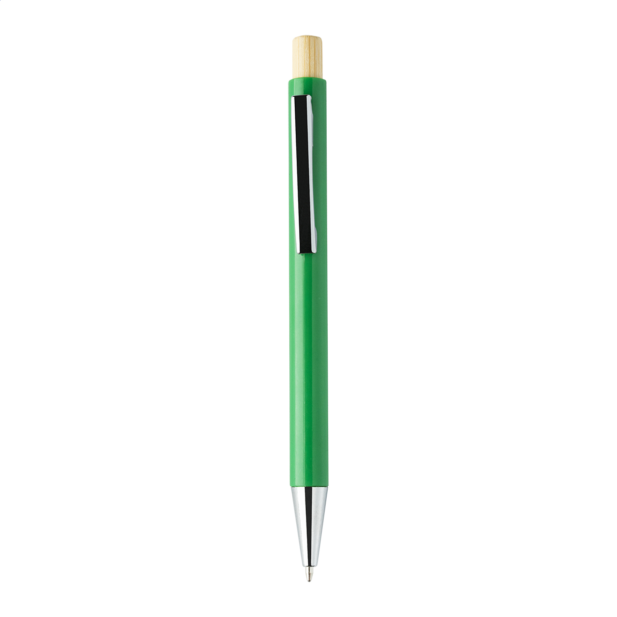 Penna a sfera in plastica ABS riciclata con pulsante in bambù, clip in metallo e refill blu.