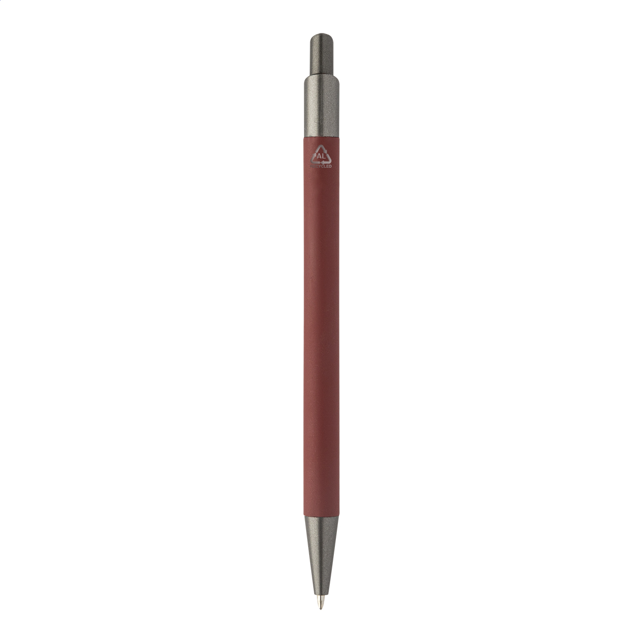 Penna a sfera in alluminio riciclato con fusto gommato e componenti in color canna di fucile. Fornita con refill blu.