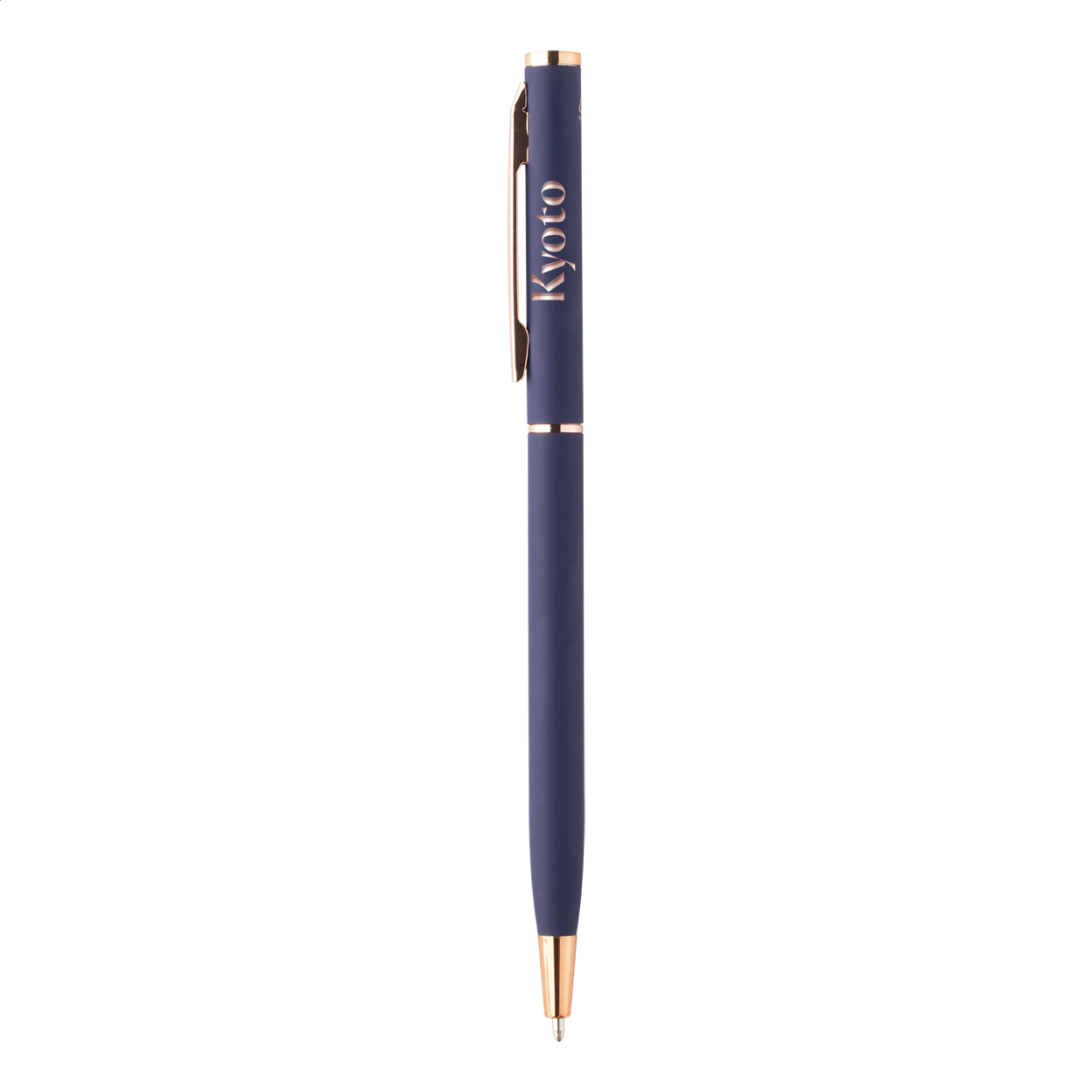 Penna a sfera in alluminio riciclato con meccanismo a rotazione, dettagli in color oro rosa, refill blu e rivestimento gommato speciale per incisione laser a specchio in colore oro rosa.