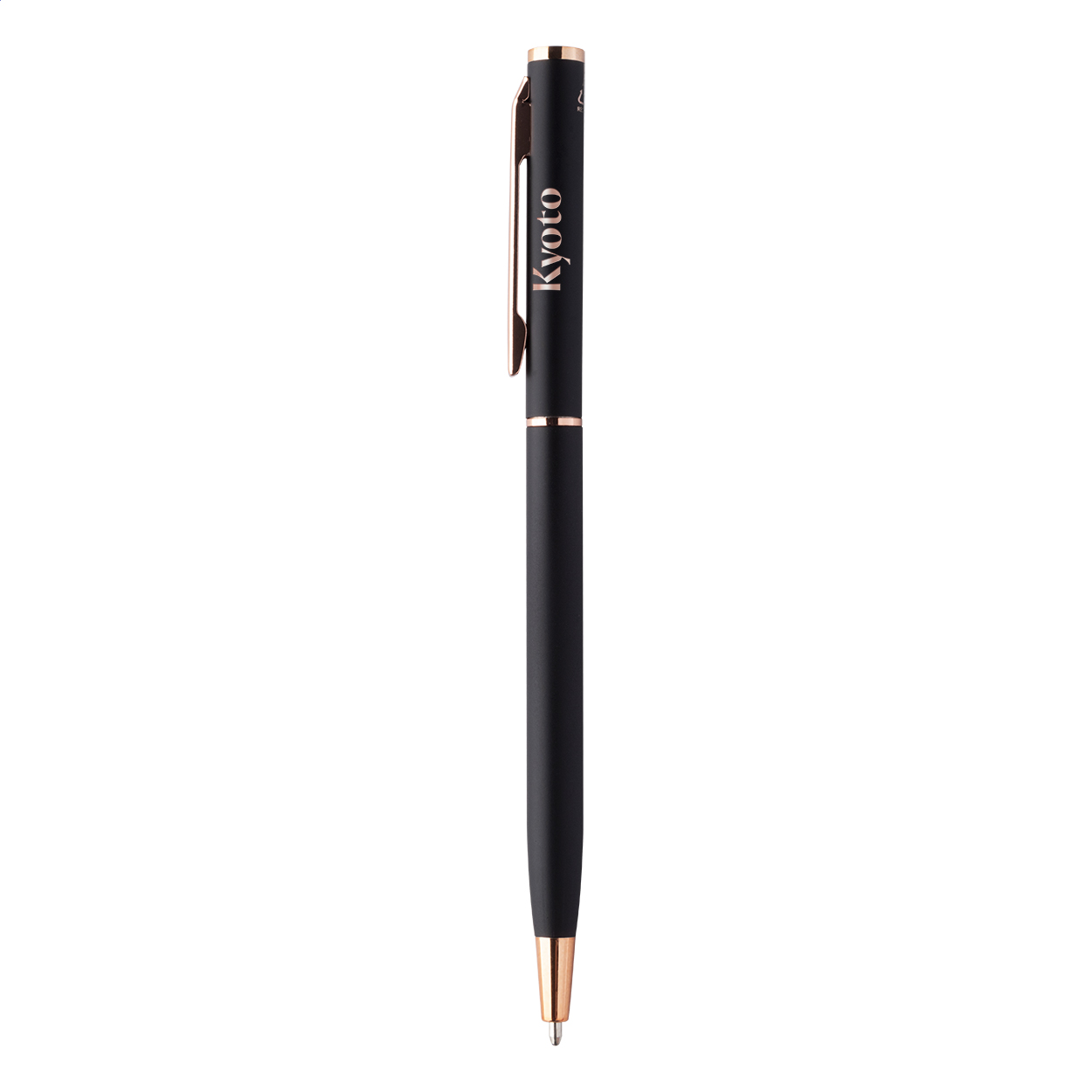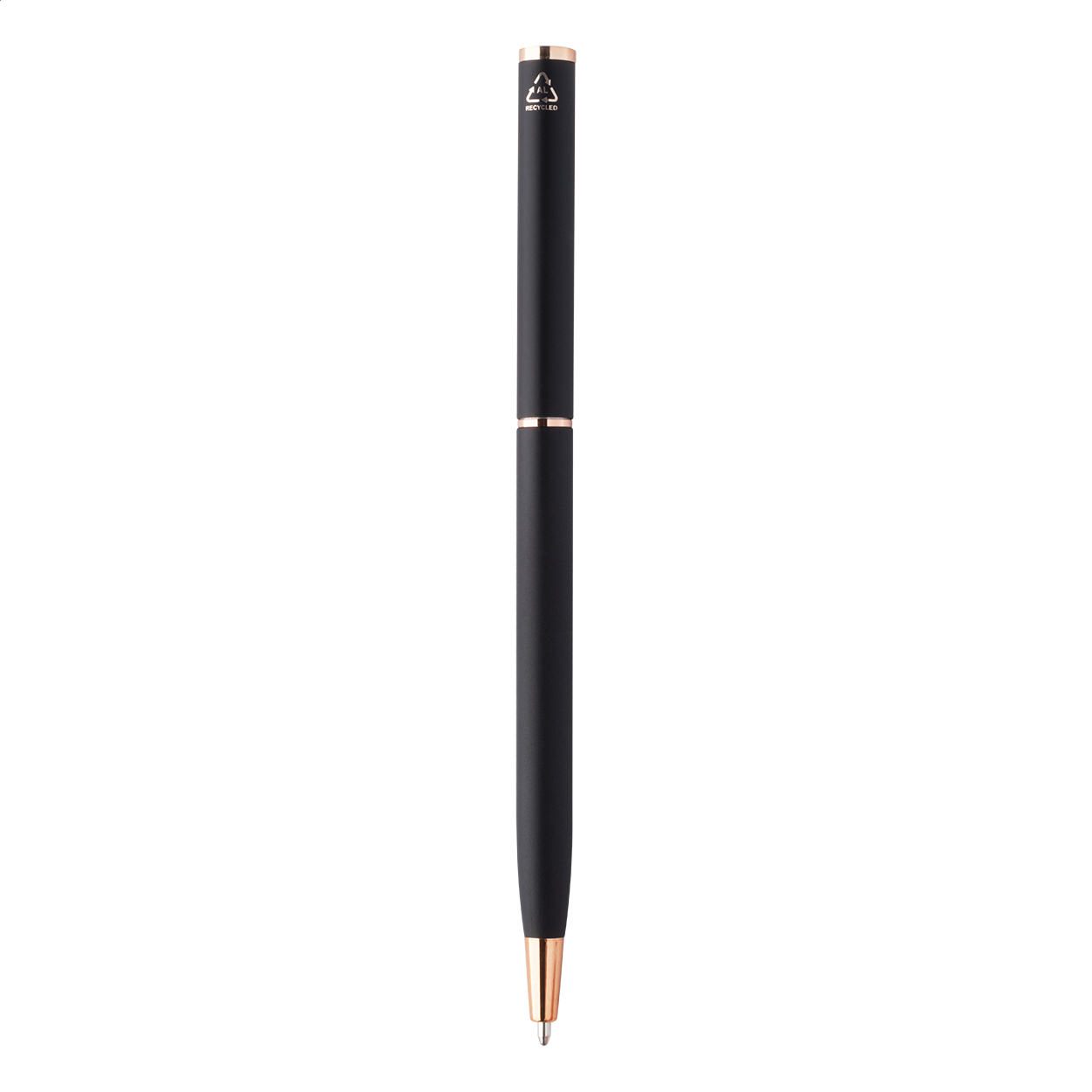 Penna a sfera in alluminio riciclato con meccanismo a rotazione, dettagli in color oro rosa, refill blu e rivestimento gommato speciale per incisione laser a specchio in colore oro rosa.