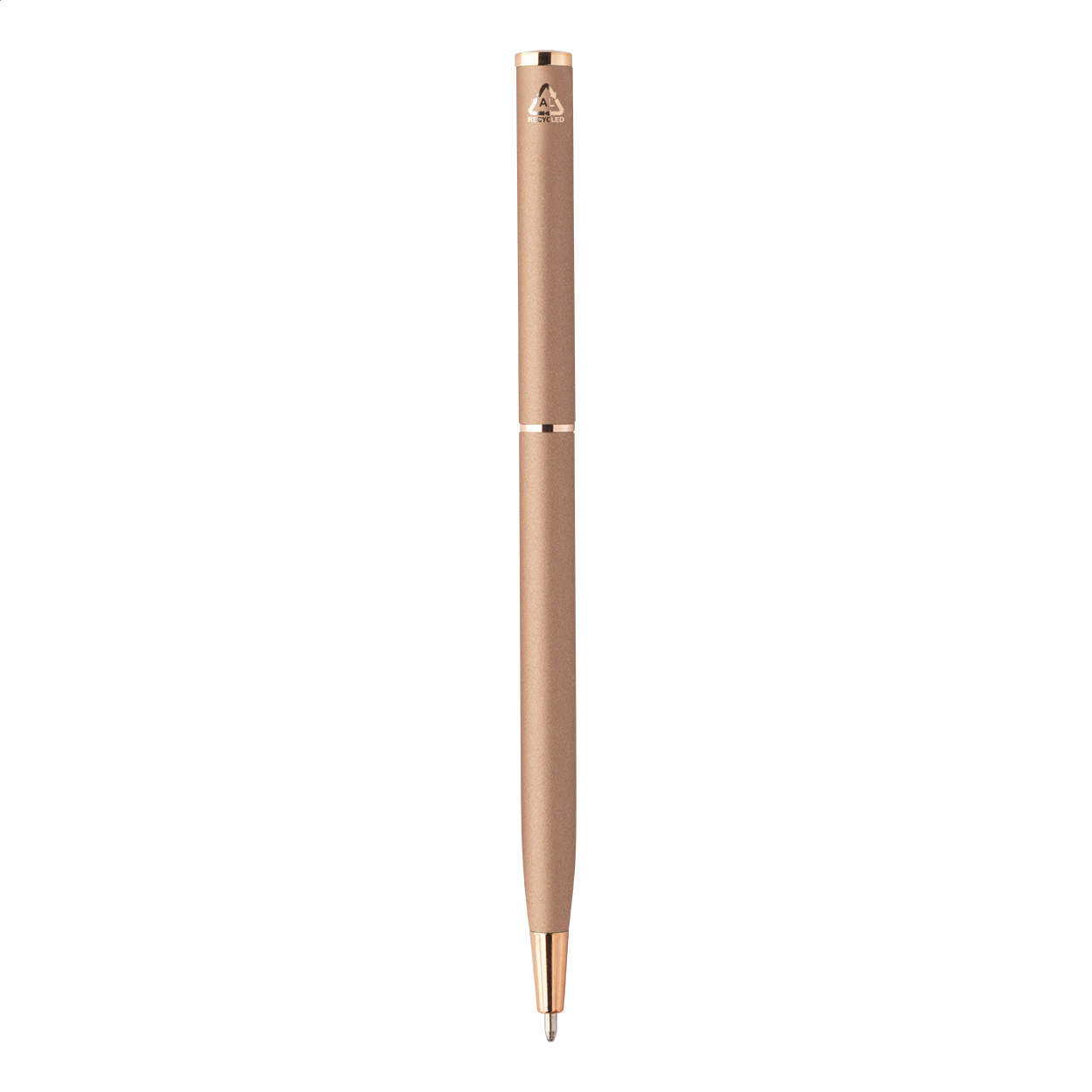 Penna a sfera in alluminio riciclato con meccanismo a rotazione, dettagli in color oro rosa, refill blu e rivestimento gommato speciale per incisione laser a specchio in colore oro rosa.