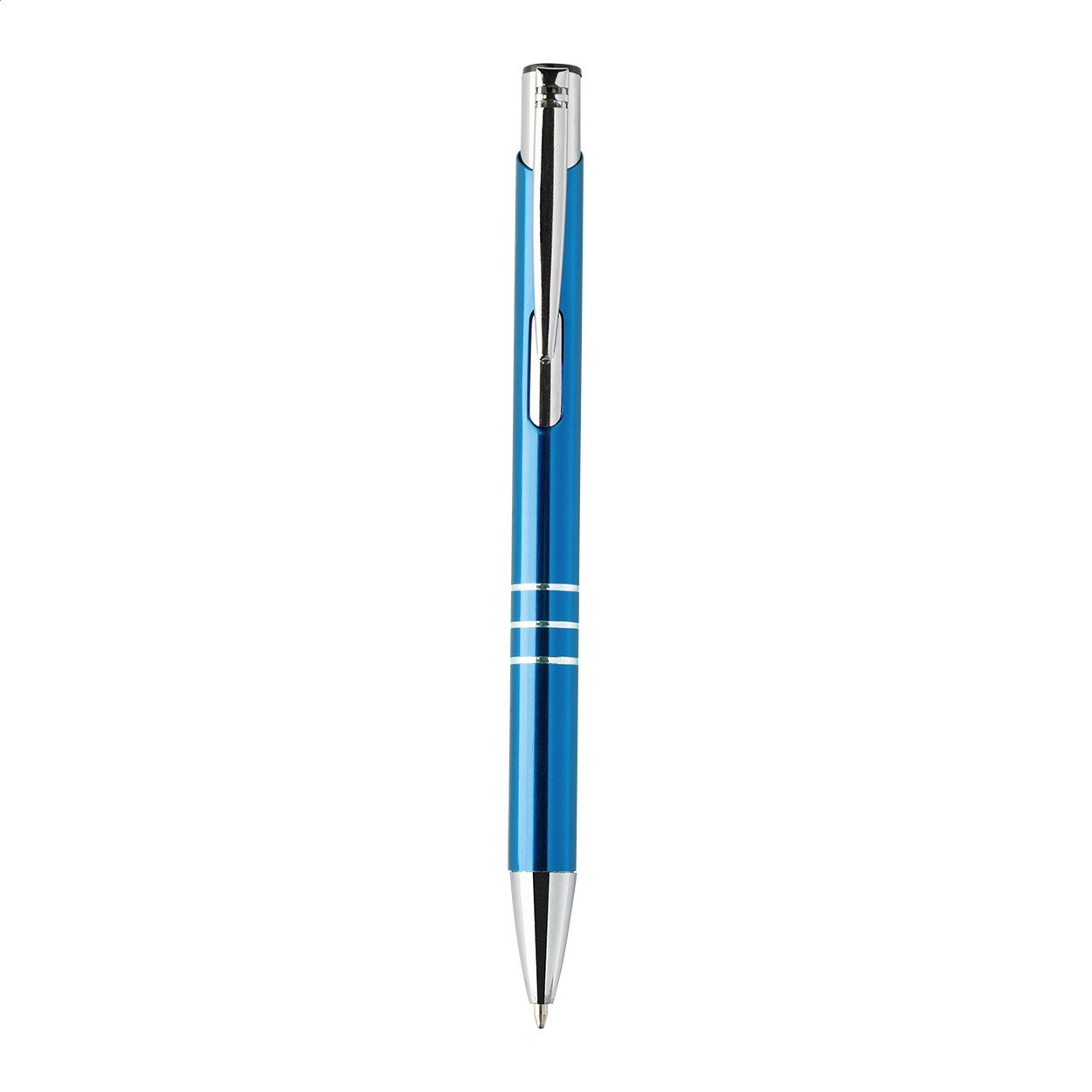 Penna a sfera in alluminio riciclato con finitura metallizzata e refill blu.