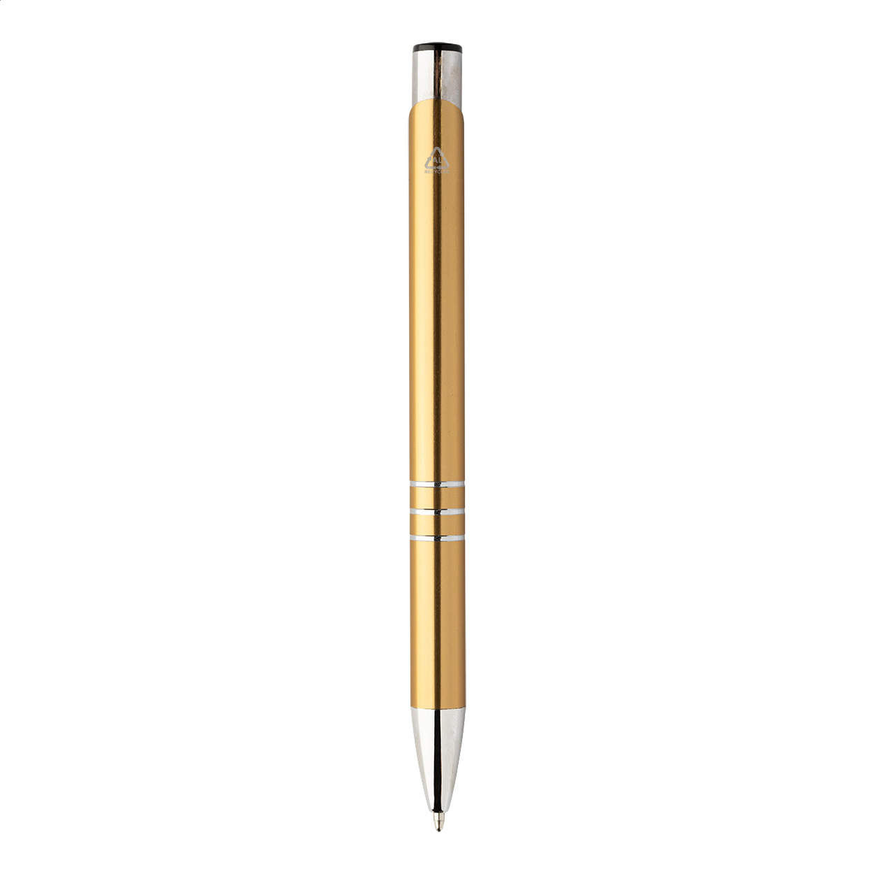 Penna a sfera in alluminio riciclato con finitura metallizzata e refill blu.