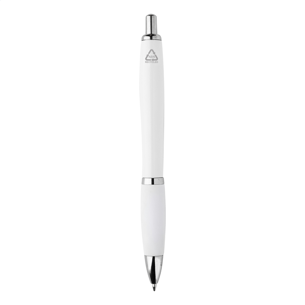Penna a sfera in plastica ABS riciclata con refill blu, impugnatura in colore coordinato e parti cromate.