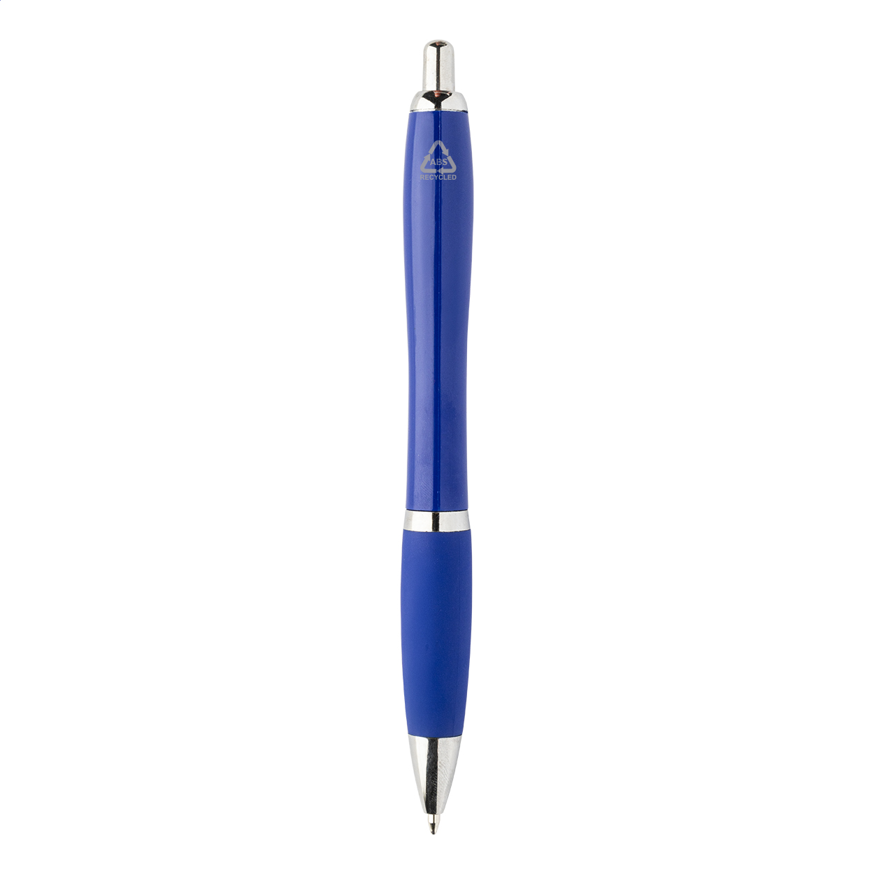 Penna a sfera in plastica ABS riciclata con refill blu, impugnatura in colore coordinato e parti cromate.