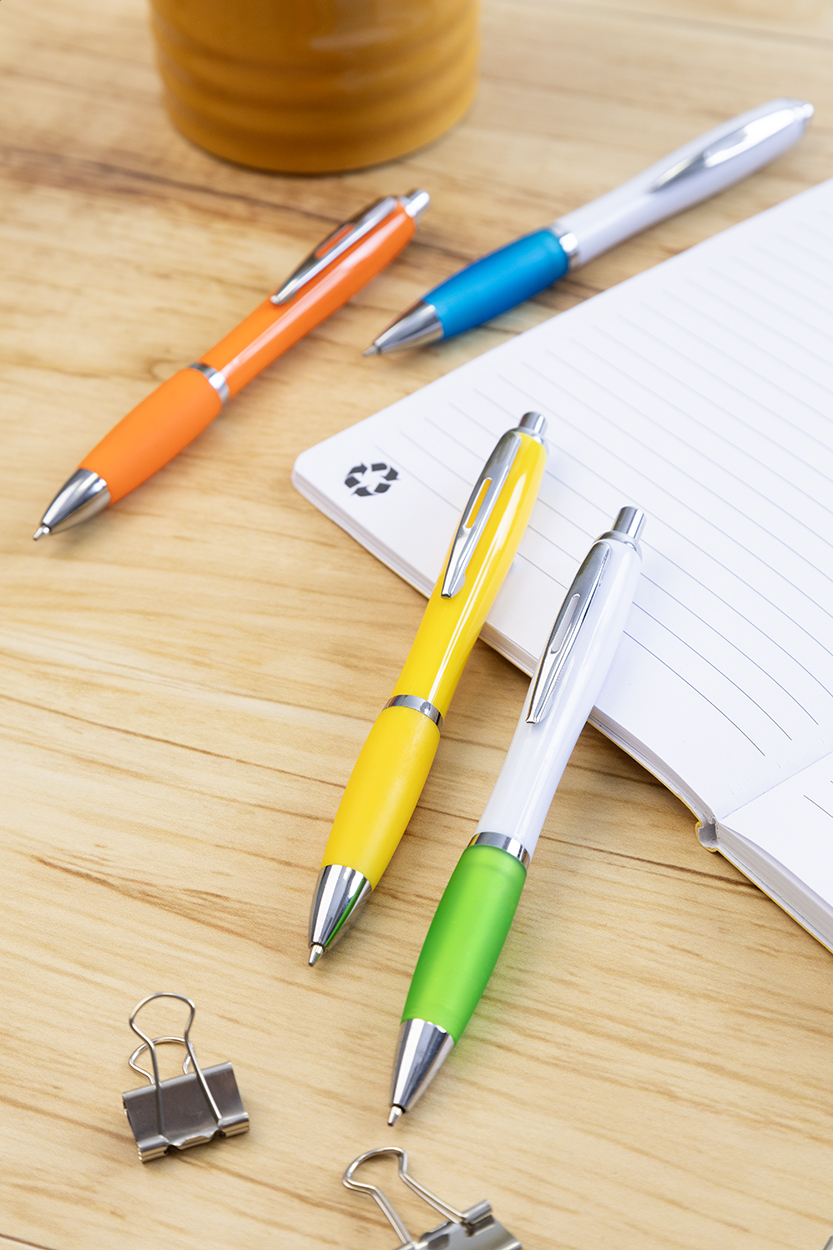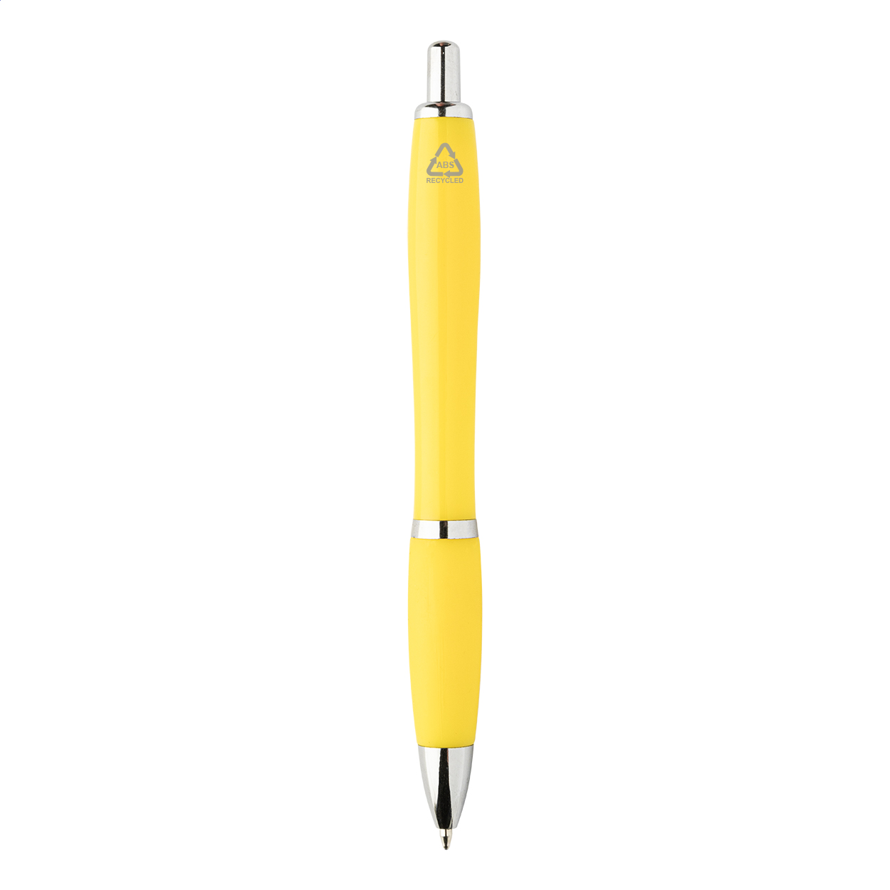 Penna a sfera in plastica ABS riciclata con refill blu, impugnatura in colore coordinato e parti cromate.
