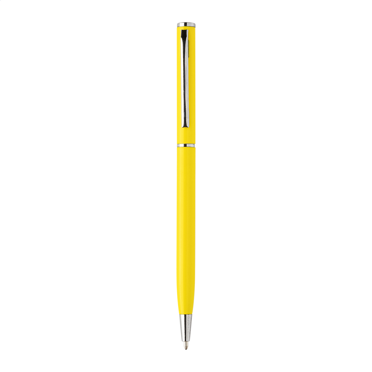 Penna a sfera in alluminio riciclato con meccanismo di apertura a rotazione e componenti cromate. Fornita con refill blu.