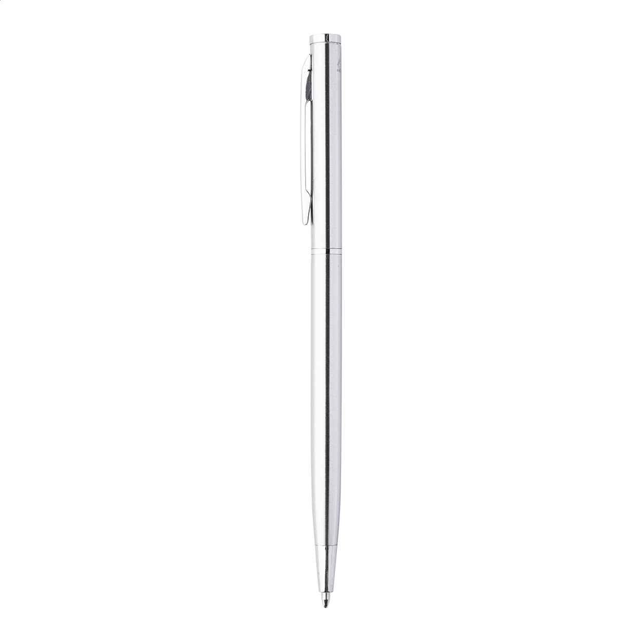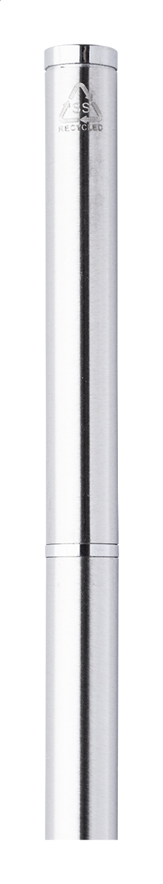 Penna a sfera in acciaio riciclato con meccanismo di apertura a rotazione e componenti cromate. Fornita con refill blu.