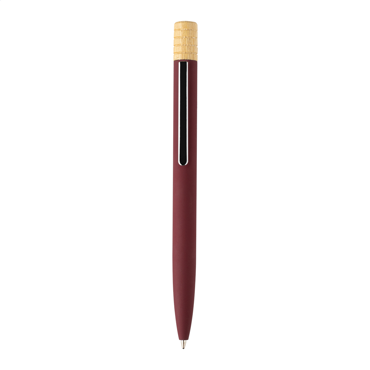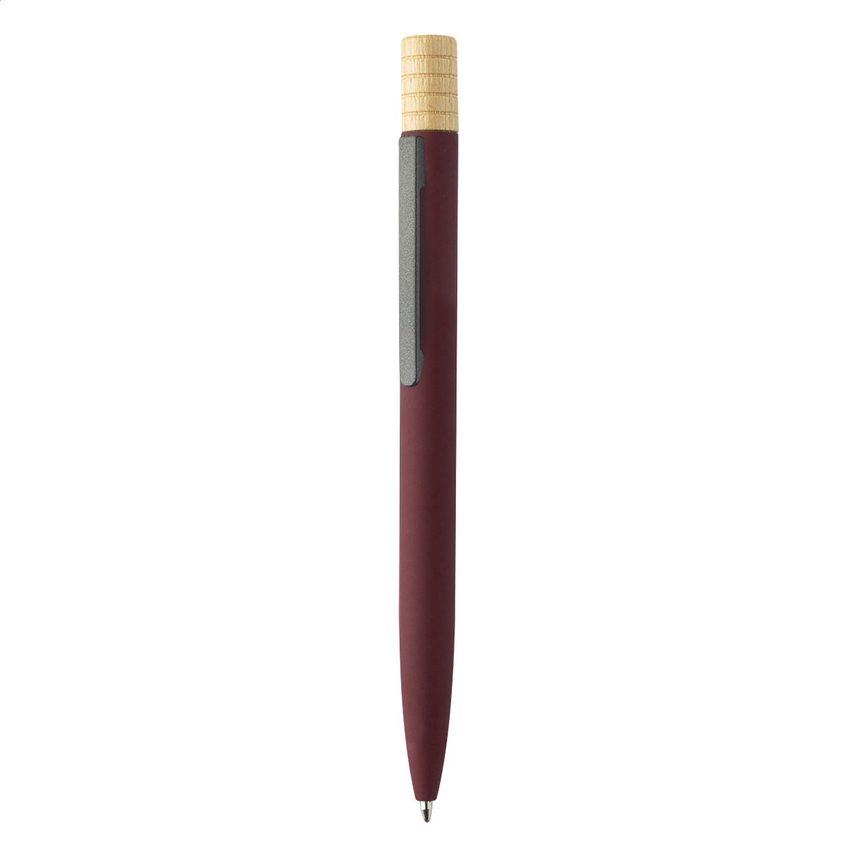 Penna a sfera in alluminio riciclato, meccanismo di apertura a rotazione, fusto gommato, componenti con finitura color canna di fucile e cappuccio in bamboo. Fornita con refill blu ed astuccio in cartoncino kraft