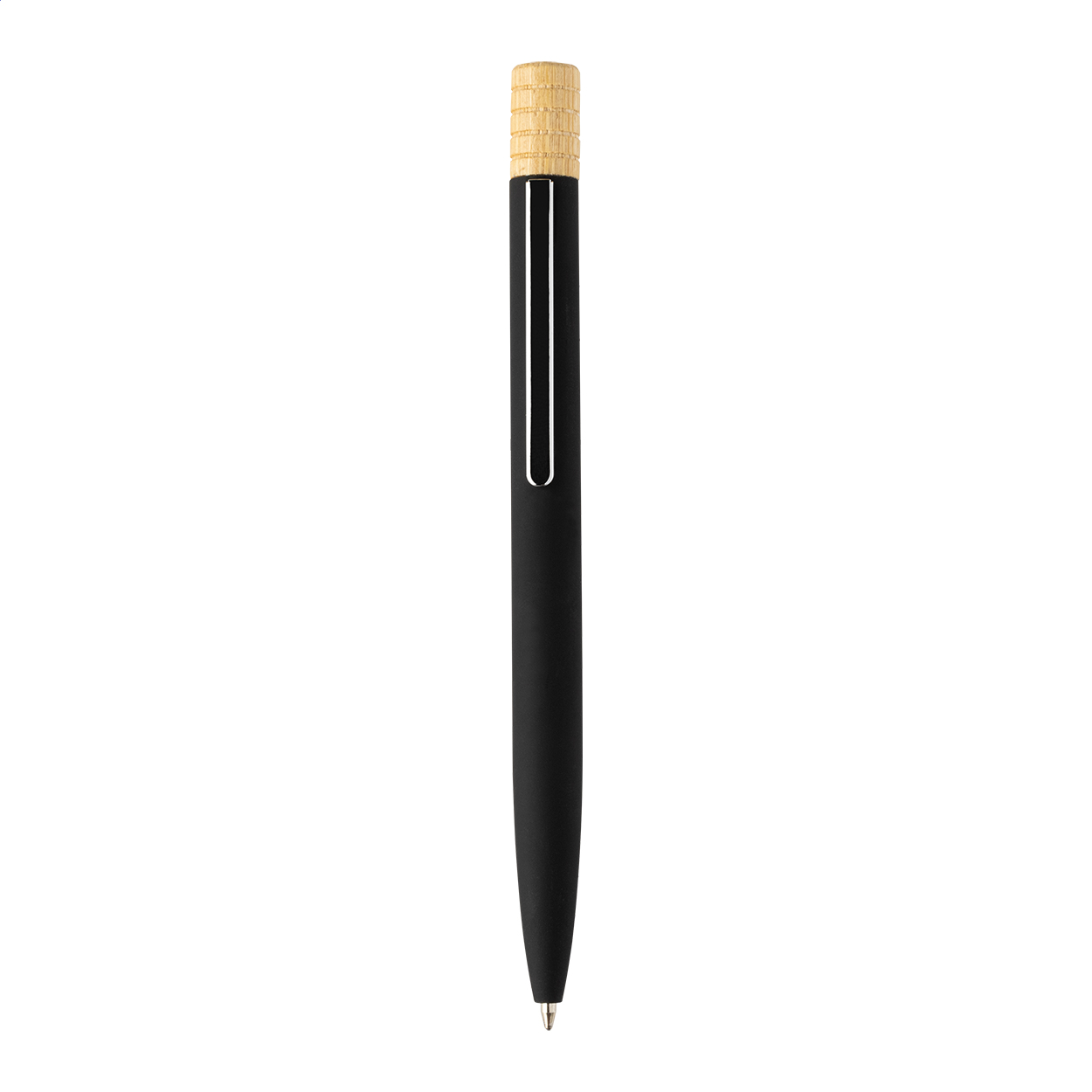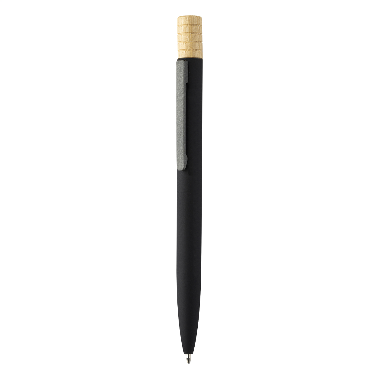 Penna a sfera in alluminio riciclato, meccanismo di apertura a rotazione, fusto gommato, componenti con finitura color canna di fucile e cappuccio in bamboo. Fornita con refill blu ed astuccio in cartoncino kraft