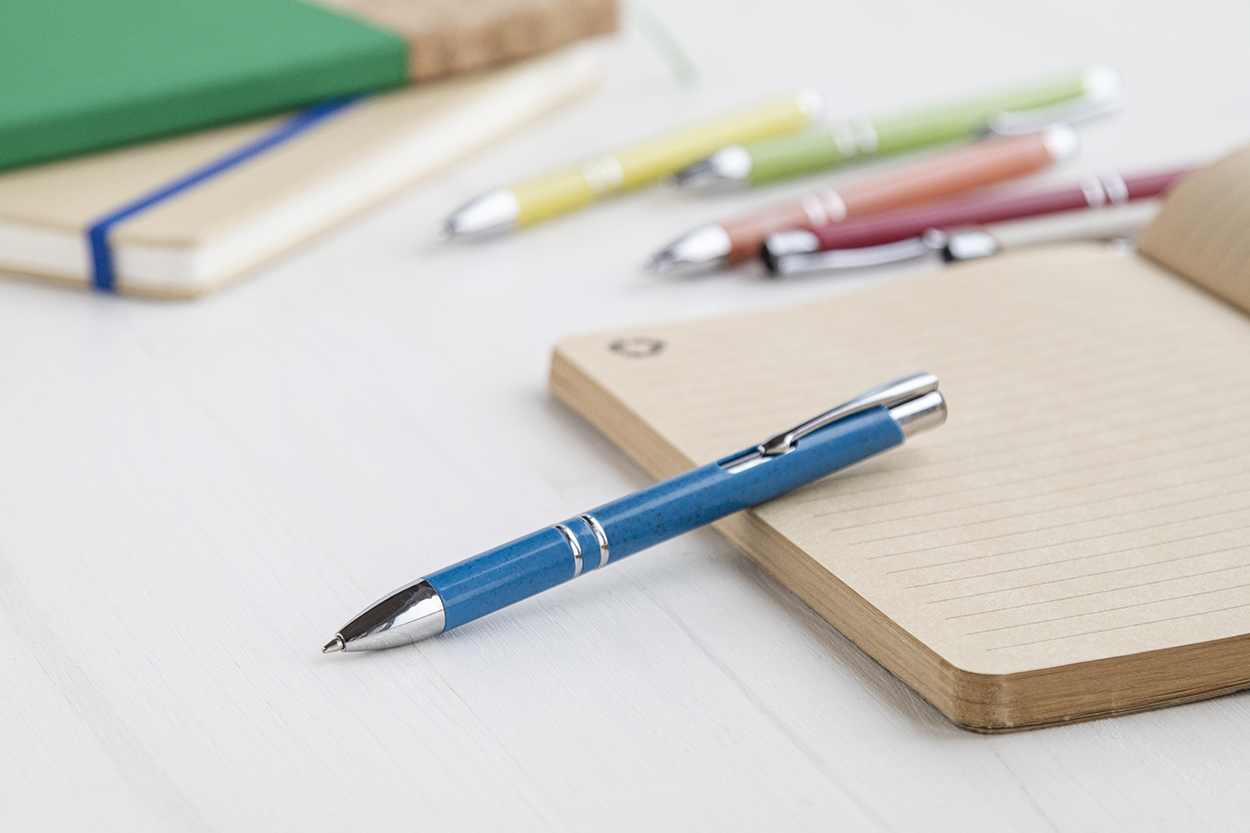 Penna a sfera in plastica ecologica con parti metalliche. Con refill blu.