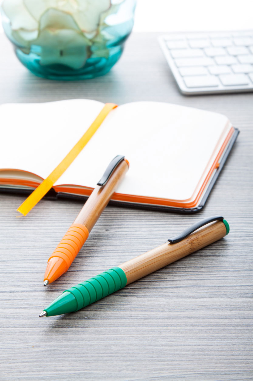 Penna a sfera in bambù con meccanismo a rotazione, clip in metallo, puntale colorato e impugnatura in gomma abbinata. Fornita con refill blu.