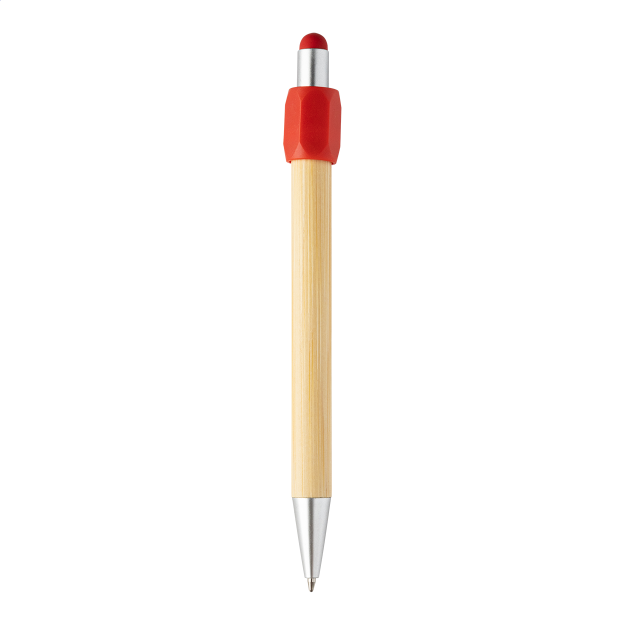 Penna a sfera capacitiva in bambù con fidget spinner in plastica ABS riciclata e refill blu.