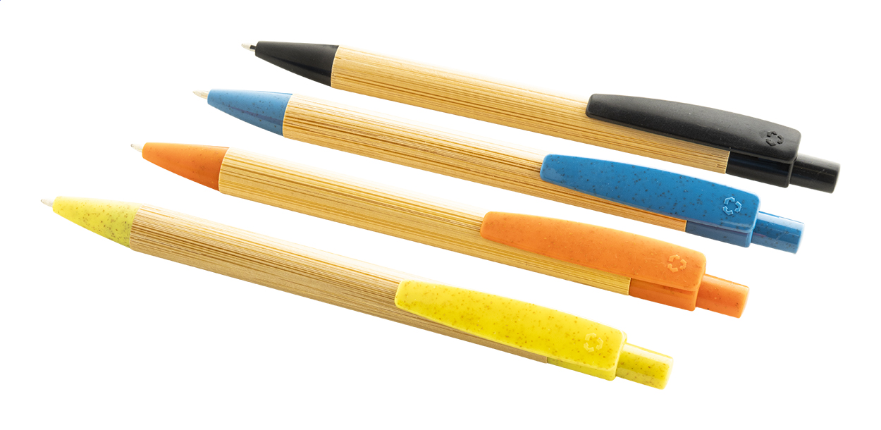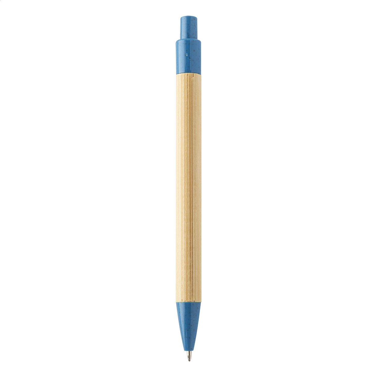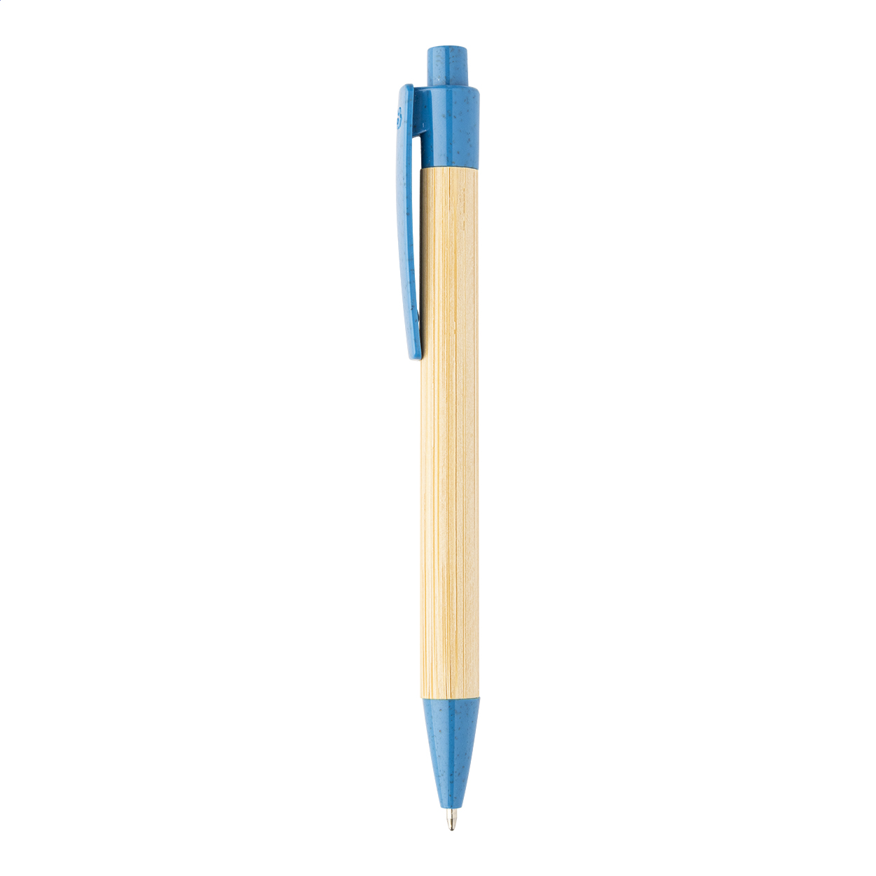 Penna a sfera di bambù con clip e puntale in plastica ecologica ricavata da paglia di grano. Con refill blu.