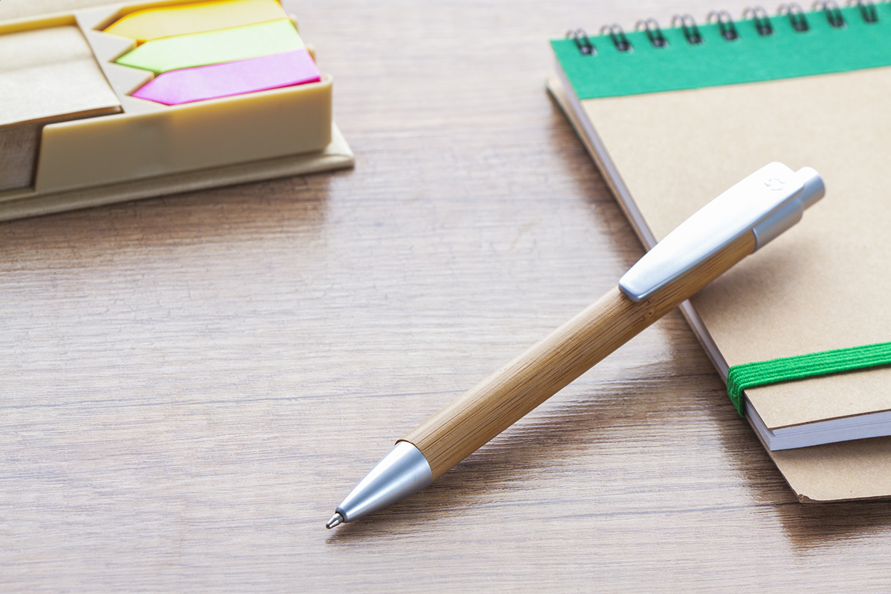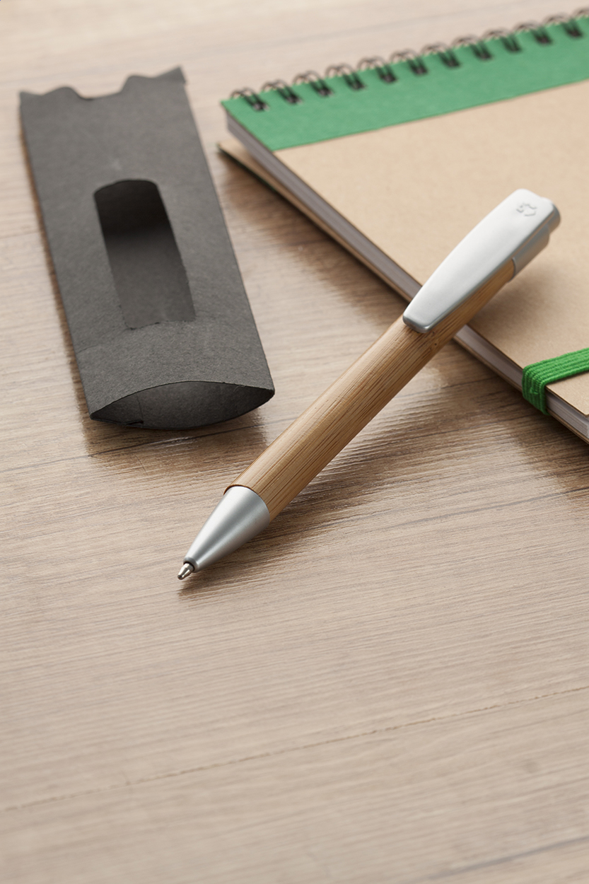Penna a sfera in bambù in confezione di cartoncino nero. Con refill blu.