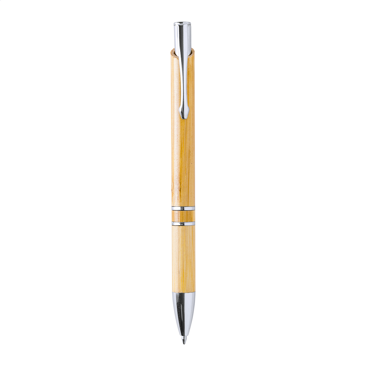 Penna a sfera in bambù con punta e clip cromati e refill nero.