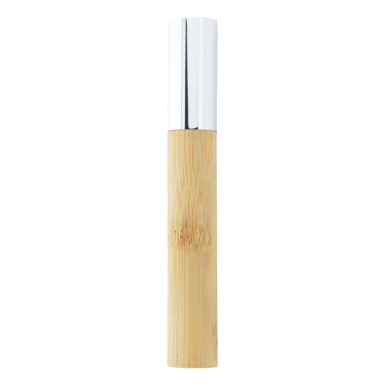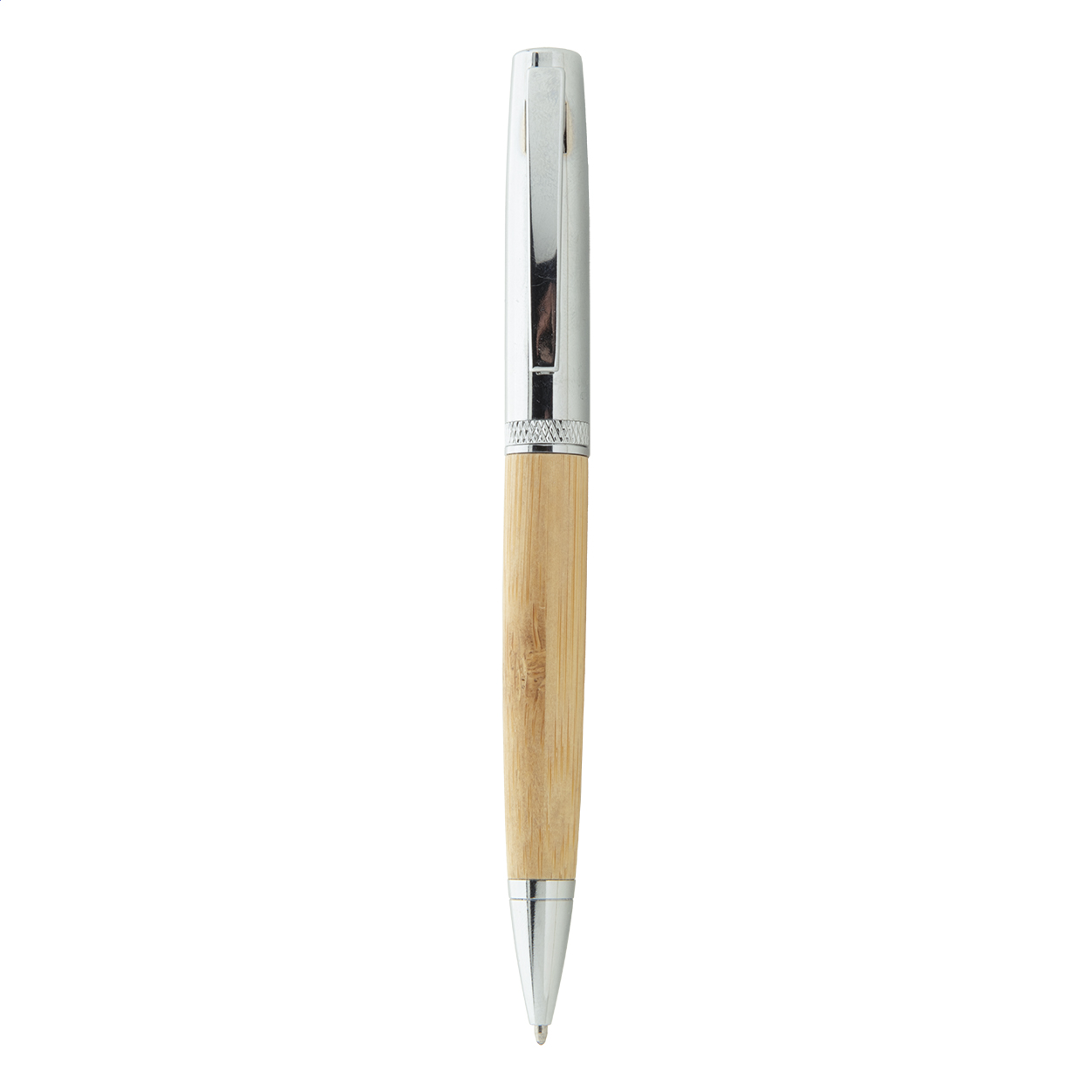 Elegante penna a sfera in metallo con meccanismo a rotazione, fusto in bambù e parti cromate lucide. In astuccio tubolare di bambù e cappuccio cromato. Con refill blu.
