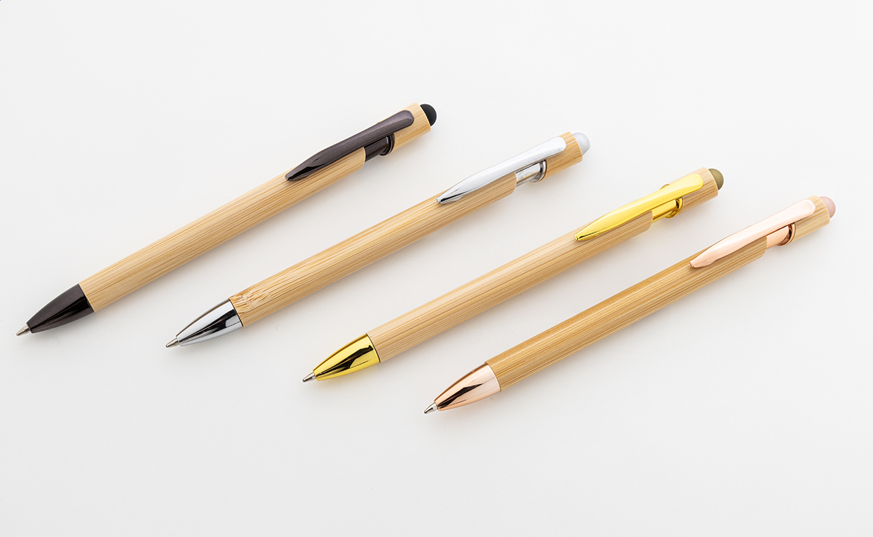 Penna a sfera in bambù con refill blu, dettagli metallici lucidi e pennino capacitivo in colore coordinato.