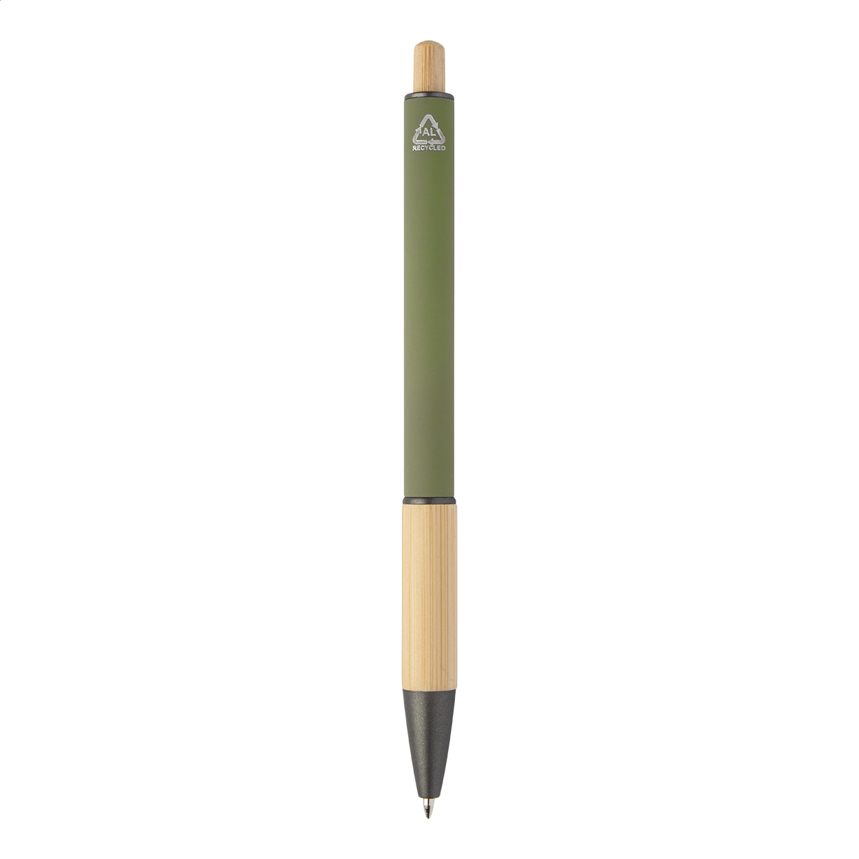 Penna a sfera in alluminio riciclato con refill blu, impugnatura e pulsante in bambù, corpo gommato e parti con finitura color canna di fucile.