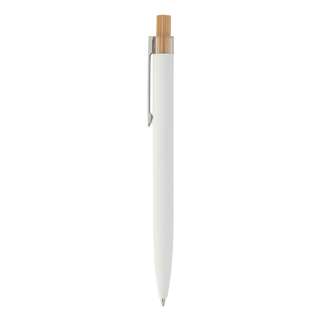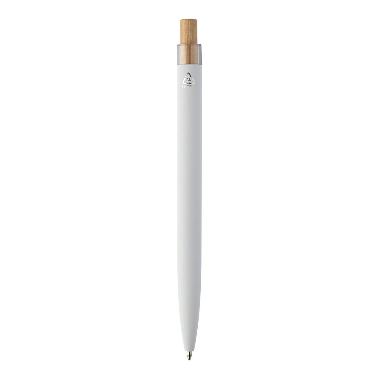 Penna a sfera in alluminio riciclato con refill blu, finitura gommata, pulsante in bambù e clip cromata. Con rivestimento speciale per incisione laser a specchio.