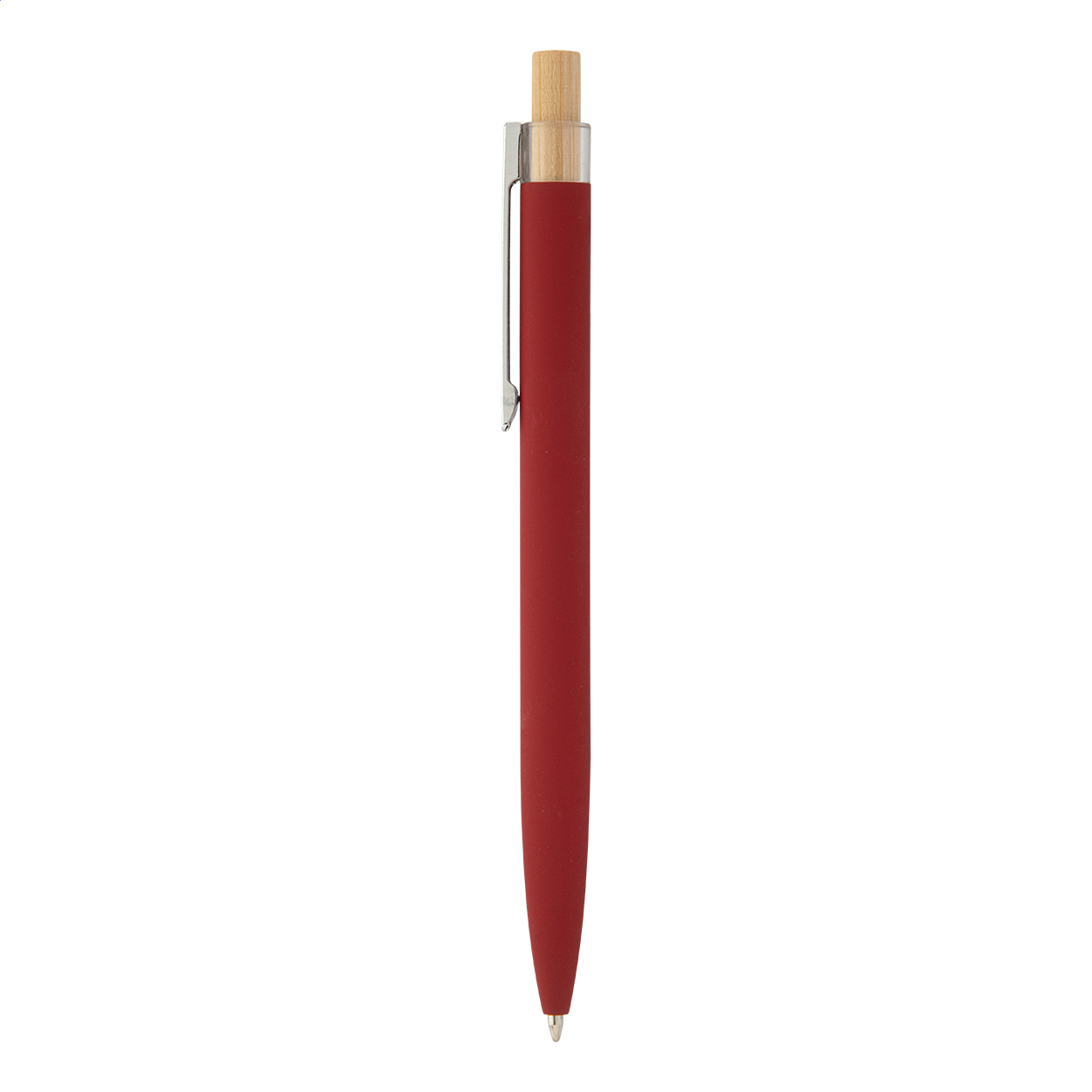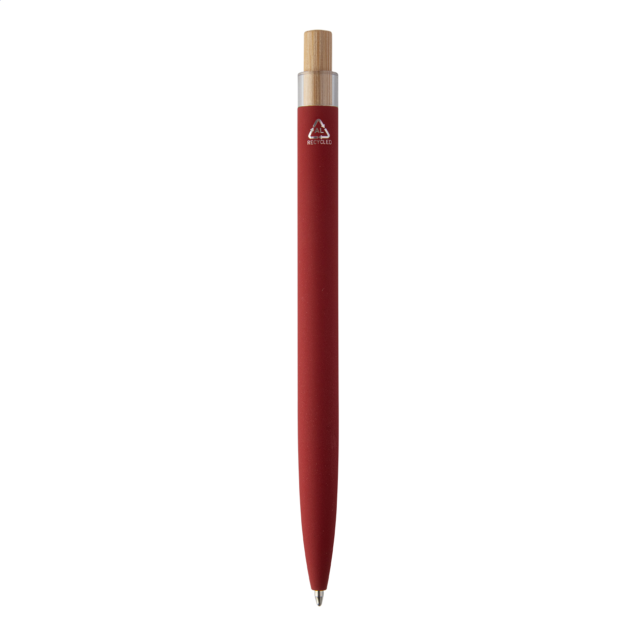Penna a sfera in alluminio riciclato con refill blu, finitura gommata, pulsante in bambù e clip cromata. Con rivestimento speciale per incisione laser a specchio.