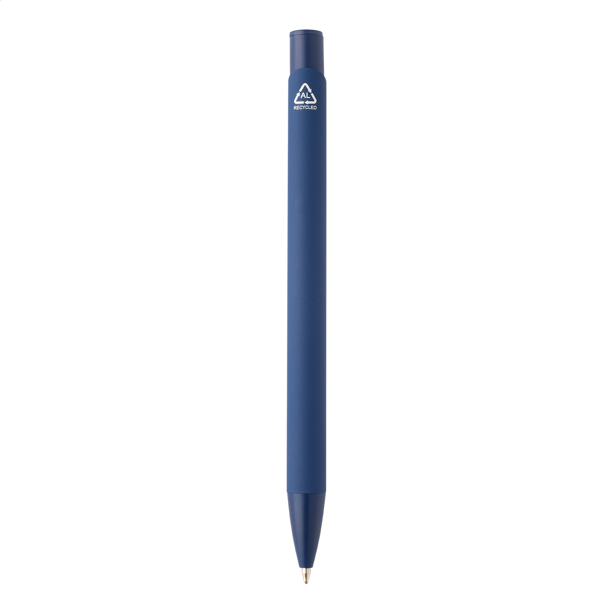 Penna a sfera in alluminio riciclato con corpo gommato, dettagli in colore coordinato e refill blu.