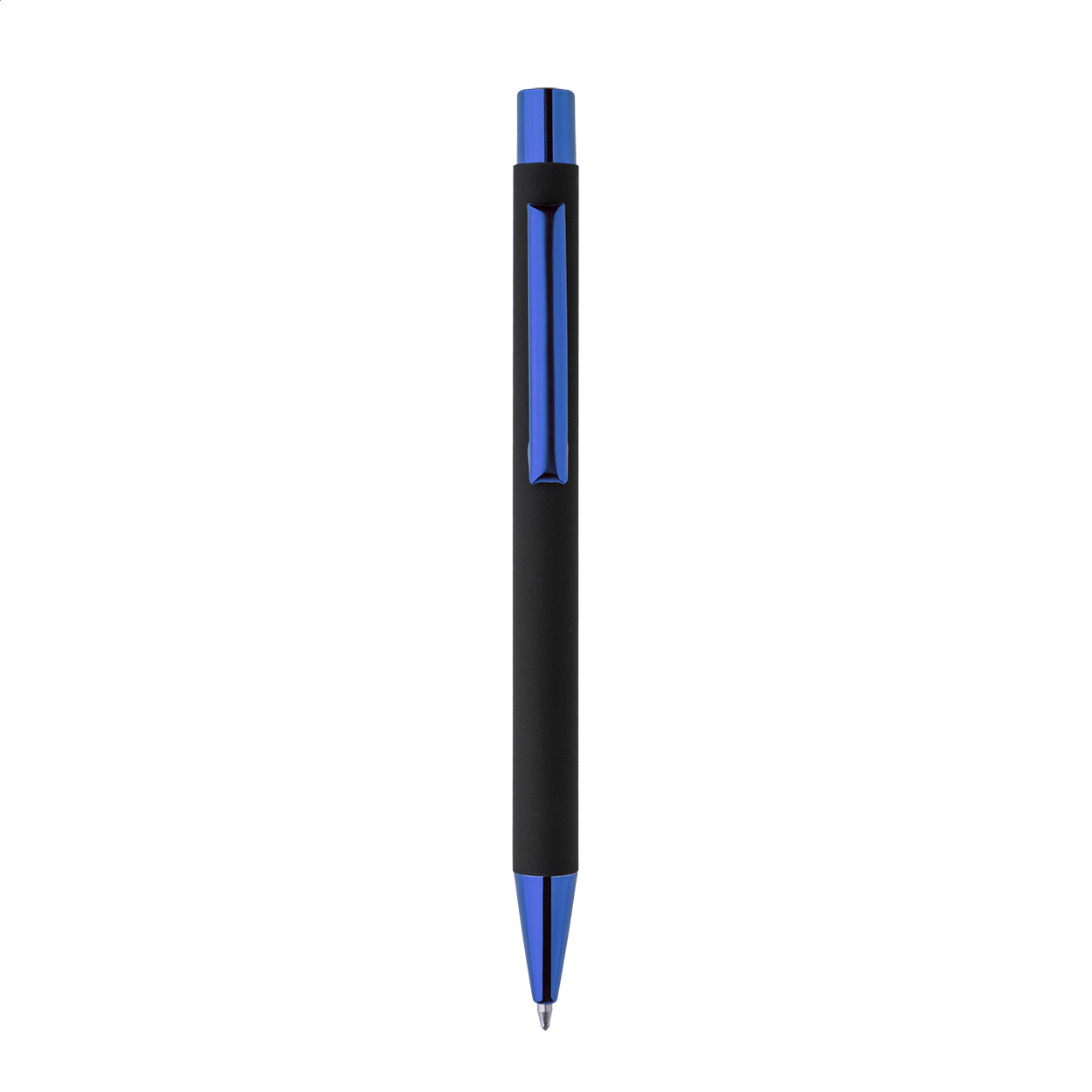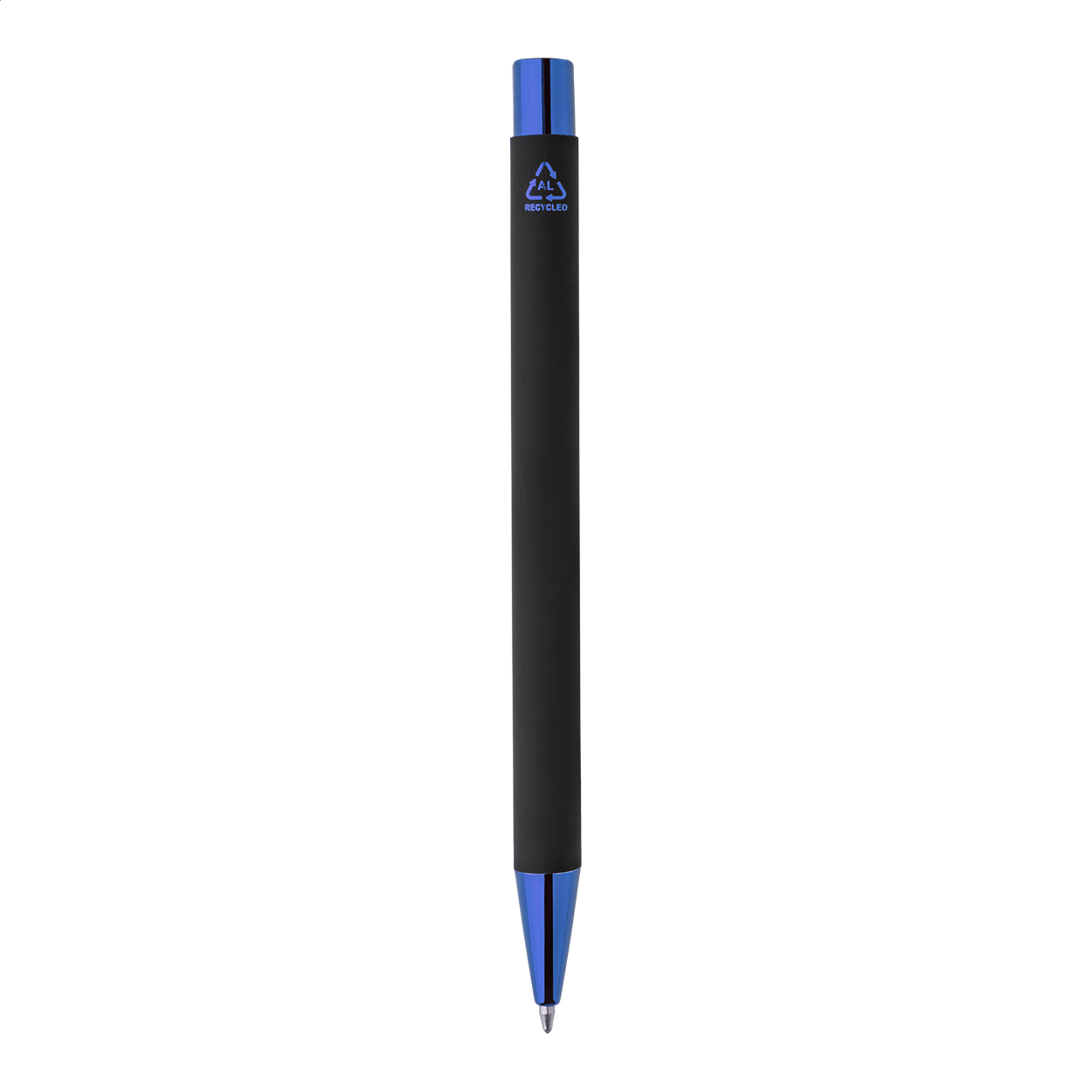 Penna a sfera in alluminio riciclato con corpo gommato nero e parti colorate con finitura metallica lucida. Lo speciale rivestimento permette l'incisione a specchio in colore coordinato delle parti metalliche. Refill blu.
