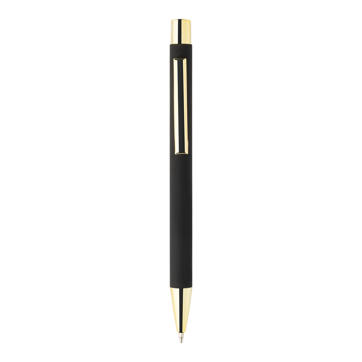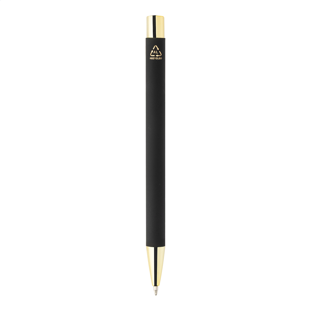 Penna a sfera in alluminio riciclato con corpo gommato nero e parti colorate con finitura metallica lucida. Lo speciale rivestimento permette l'incisione a specchio in colore coordinato delle parti metalliche. Refill blu.