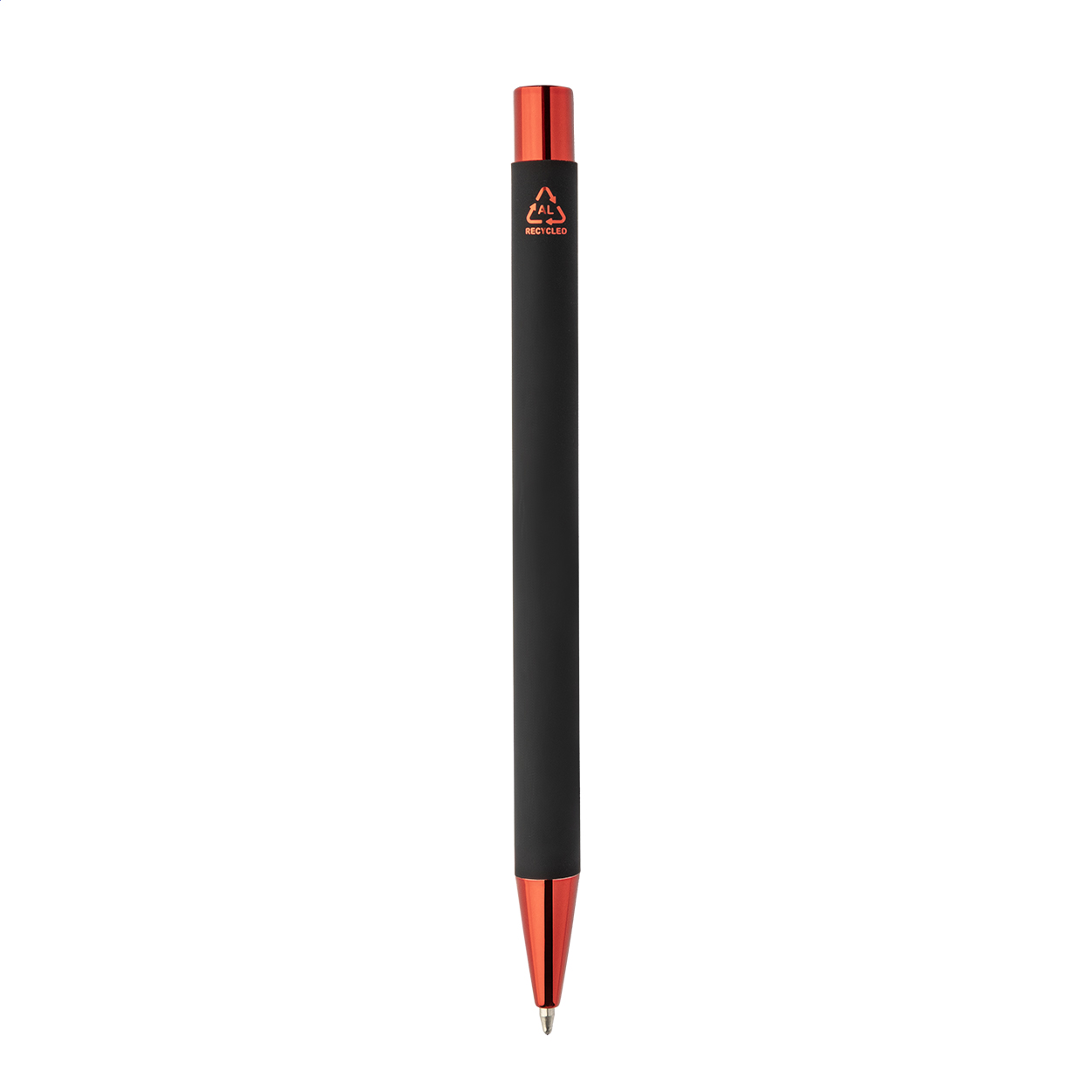Penna a sfera in alluminio riciclato con corpo gommato nero e parti colorate con finitura metallica lucida. Lo speciale rivestimento permette l'incisione a specchio in colore coordinato delle parti metalliche. Refill blu.