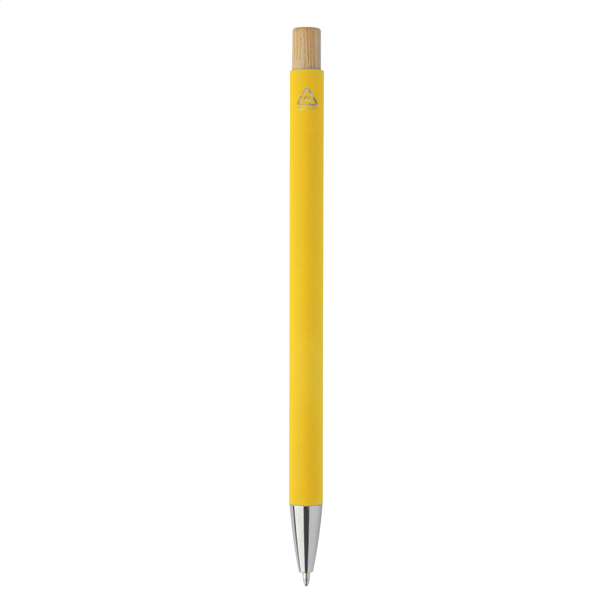 Penna a sfera in alluminio riciclato con finitura gommata, pulsante in bambù, dettagli cromati e refill blu. Con rivestimento speciale per incisione laser a specchio.