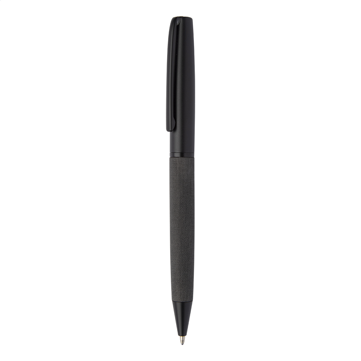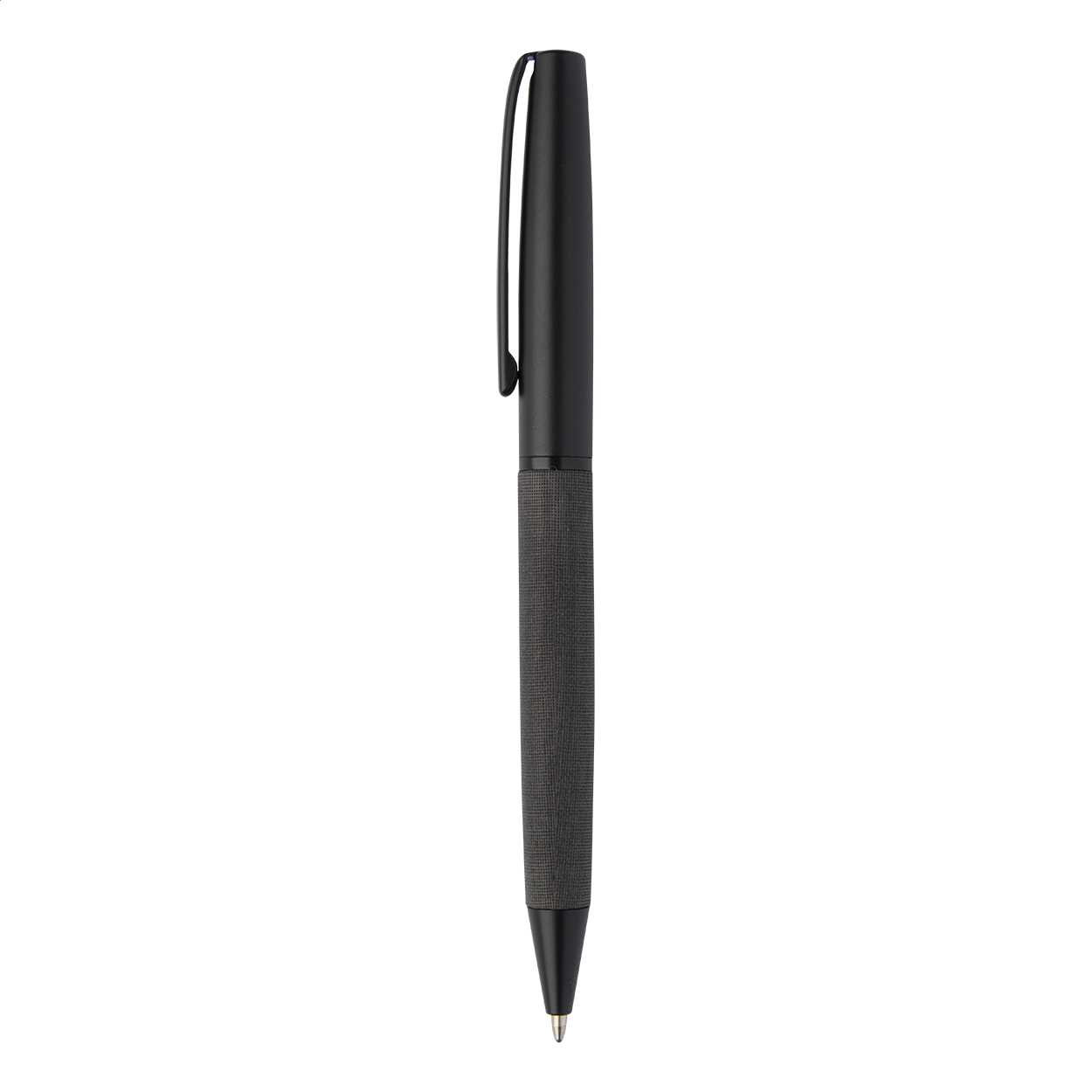 Elegante penna a sfera in metallo con meccanismo a rotazione, refill blu, fusto rivestito in pelle PU e parti nere. In confezione regalo nera.