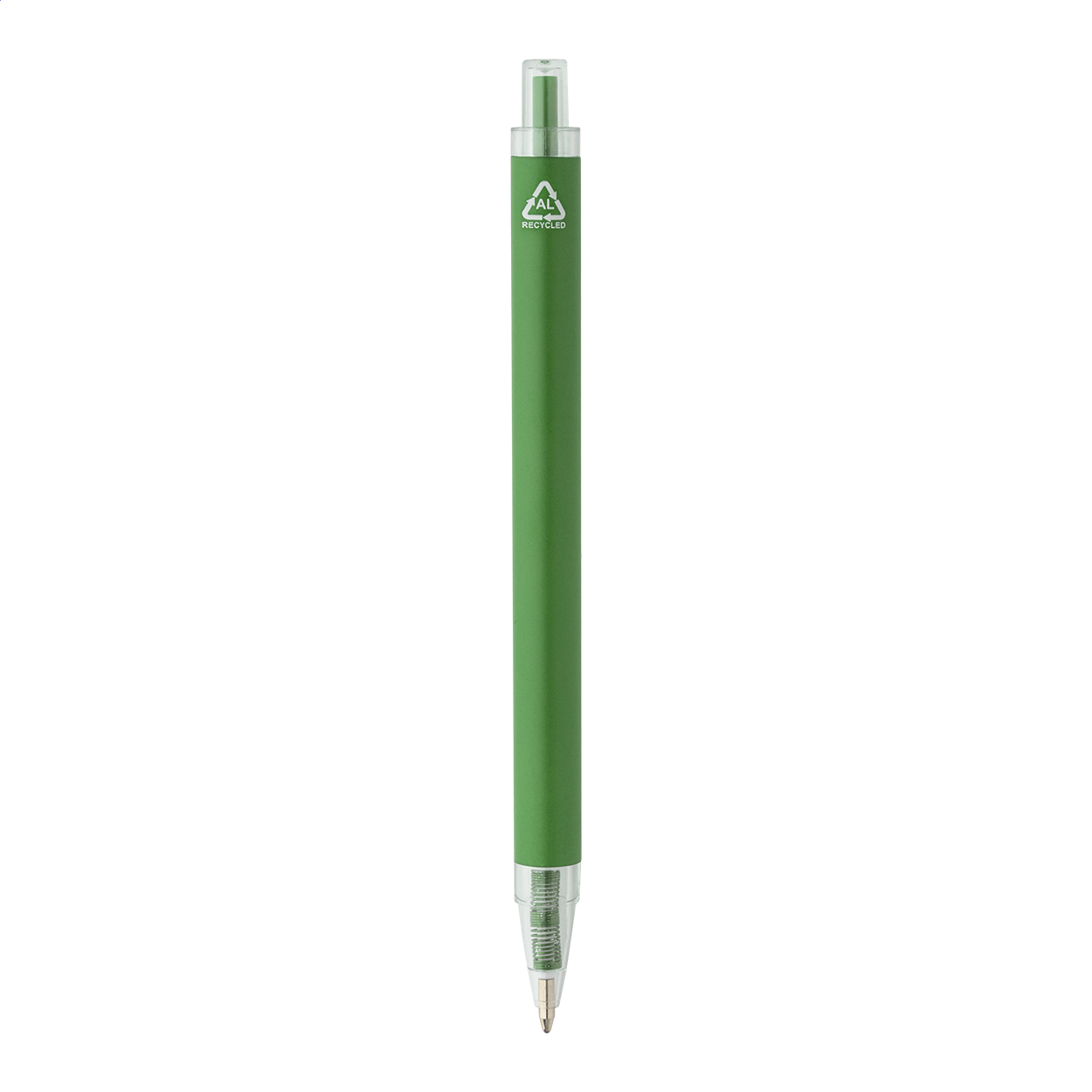 Penna a sfera in alluminio riciclato con corpo opaco e parti trasparenti in RPET. Refill blu.